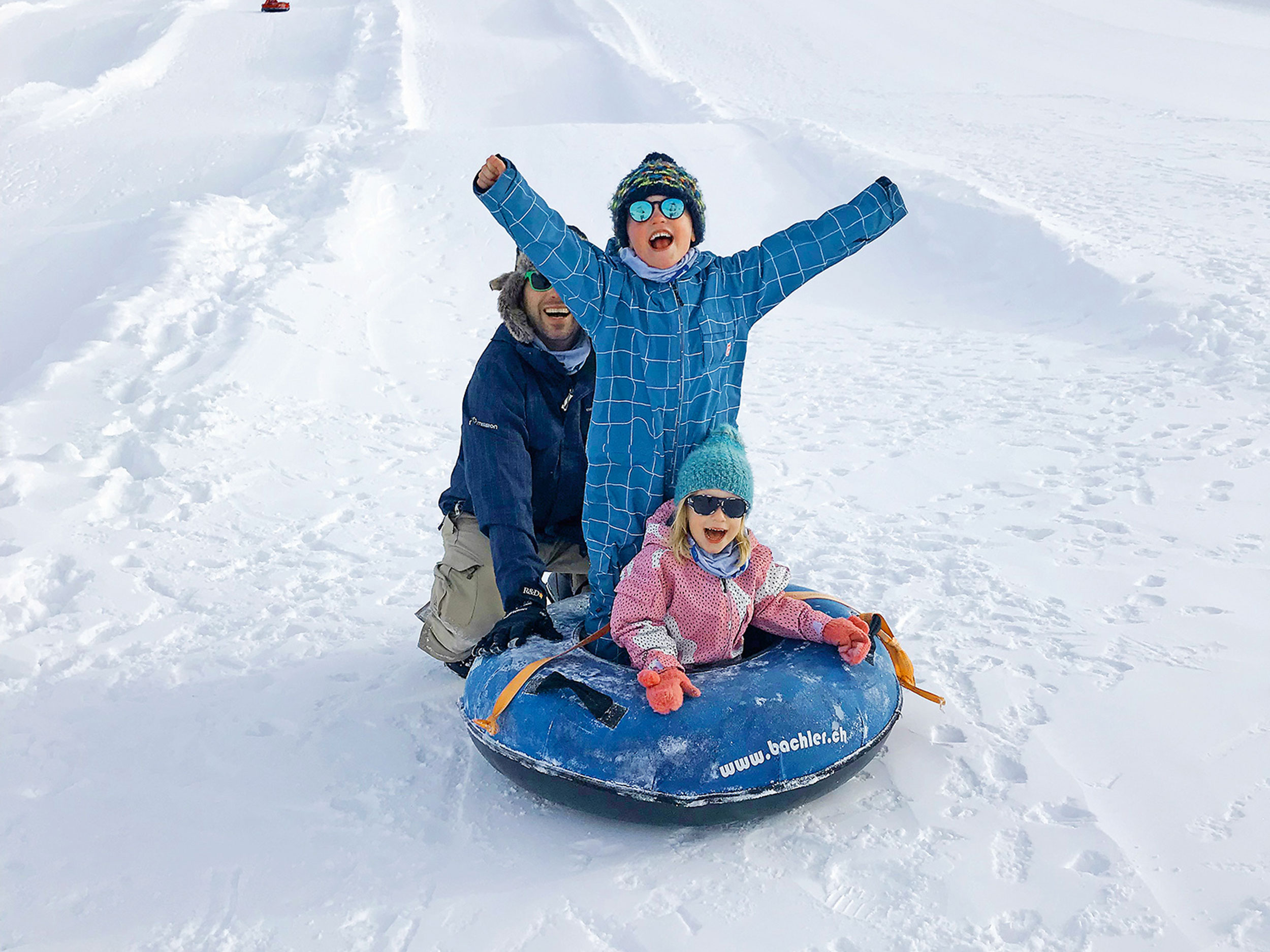 Am nächsten Tag ersetzen wir Skifahren durch Snowtubing – und haben plötzlich schneesportbegeisterte Kinder. Die Stimmung steigt, während die Temperatur unserer Tochter wieder sinkt. Wir bauen Tunnel und Rutschbahnen in den meterhohen Schnee. Geniessen den Whirlpool im Hallenbad, während die Kinder im Becken plantschen. Fahren einzeln über die perfekt präparierten Pisten, während die Kinder Mittagsschlaf machen. Decken uns im Dorf mit Raclettekäse, Wurst und heimischem Brot ein und schaffen uns so unsere vielen kleinen Berg-Highlights.