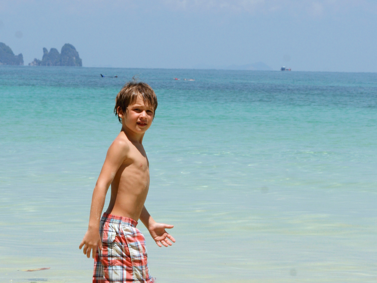 In der Zwischenzeit hat sich unsere Reisegruppe vergrössert. Unsere Nachbarn aus der Schweiz sind dazugestossen und werden uns in den nächsten Wochen begleiten. Drei Kinder – zwei davon mit Flügeli ausgerüstet, weil es auf Longtailboats selten Schwimmwesten gibt, und vier Erwachsene machen sich auf zum Robinson-Crusoe-Abenteuer. Unter höllischem Motorenlärm fährt uns Bootsmann John über die Andamanensee Richtung Koh Jum. Das Inselleben sollte die letzten Fesseln unseres Alltagskorsetts sprengen. Was auch gelang. Ich möchte an dieser Stelle aber trotzdem eine Warnung aussprechen: Das Inselleben macht denkfaul! Und zwar so richtig. Eines der wenigen Probleme, das sich einem reisenden Insulaner täglich stellt, ist: Soll ich heute mal den Coconut-Shake oder doch lieber einen Mango-Lassi bestellen – das Green oder das Red Curry? That's it! Koh Jum eignet sich für diese wohltuende Verblödung perfekt. Denn in den meisten Resorts der Insel gibts keine Elektrizität. Auch bei uns nicht. Kein TV, keine blinkenden Reklametafeln, keine E-Mails. Oder zumindest fast keine. Zugegeben: Auch ich gebe unseren iPad manchmal an der Rezeption ab, um ihn am Stromaggregator aufzutanken. Und auch ich versuche, mit der zivilisierten Welt per Mail in Kontakt zu treten. Dies erweist sich aber als äusserst nervenaufreibend, weil meist kein Netz vorhanden ist, und deshalb sehe ich schon bald von solchen Aktionen ab. Was zu anstrengend wird, lasse ich fortan bleiben – ob ich mit diesem Prinzip wohl auch durch unseren Alltag kommen würde?