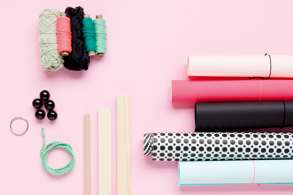 3 Rundholz auf ca. 65 cm ablängen. An einem Ende ein Loch bohren (Ø 6 mm). Den Schlüsselring hineindrehen. Das Rundholz aufhängen. Mit der ersten Garnfarbe unterhalb des Rings ein Stück von ca. 1 cm umwickeln. Garnanfang und -ende mit Bastelleim auf dem Rundholz fixieren. Von unten das erste Hölzchen (kleinste Grösse) auf das Rundholz schieben bis zum Garngewickel.