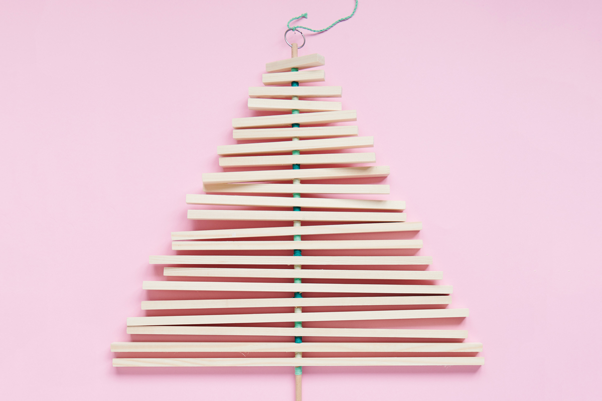 4 Bastelkleber unterhalb der Holzleiste auf das Rundholz auftragen und mit der gewünschten Garnfarbe satt an der Holzleiste den nächsten Abstand wickeln. So fortfahren bis zur letzten Holzleiste (60 cm). Den Holztannenbaum auf die gewünschte Höhe hängen.