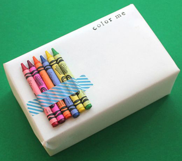 Eine besonders nette Verpackungsidee haben wir auf einem griechischen Blog gefunden: Einfach ein paar Wachsmalstifte aufs Geschenk kleben, damit das Kind – wenns zu lange geht bis zur Bescherung – die Zeit mit Malen überbrücken kann.