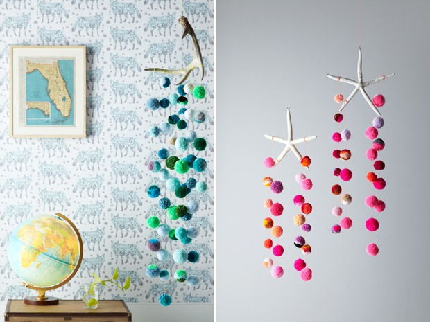 Es wird noch dreissig kalte und dunkle Winterabende geben bis Heiligabend. Wer jeden Abend ein hübsches Woll-Pompons produziert, kann sich entweder ein so hübsches Mobile wie die von Textildesignerin Dana Haim in die Stube hängen – oder aber sie anstatt Christbaumkugeln ans Bäumchen hängen. Pompons kann man übrigens auch prima mit kleinen Kindern machen.