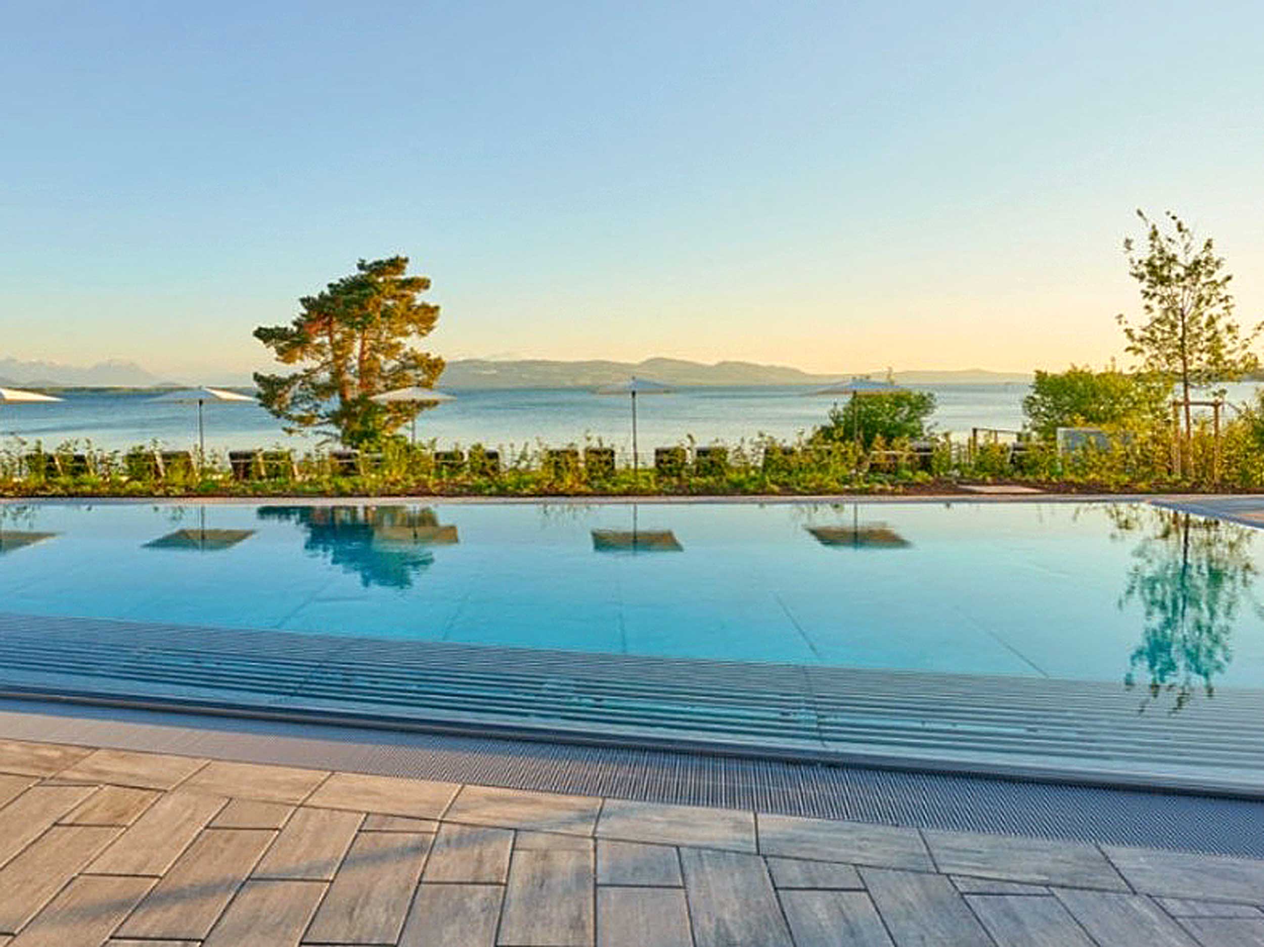Wem der Bodensee nicht genügt, kann in der 2021 eröffneten Therme Lindau Wasser in verschiedensten Formen, Temperaturen, ja, Farben und Tönen erleben. Praktisch: Der Eintritt zu den verschiedenen Bereichen wie Strandbad, Familienbad, Therme, Sauna etc. kann flexibel gewählt werden. Preise zwischen € 2.— und € 32.50.