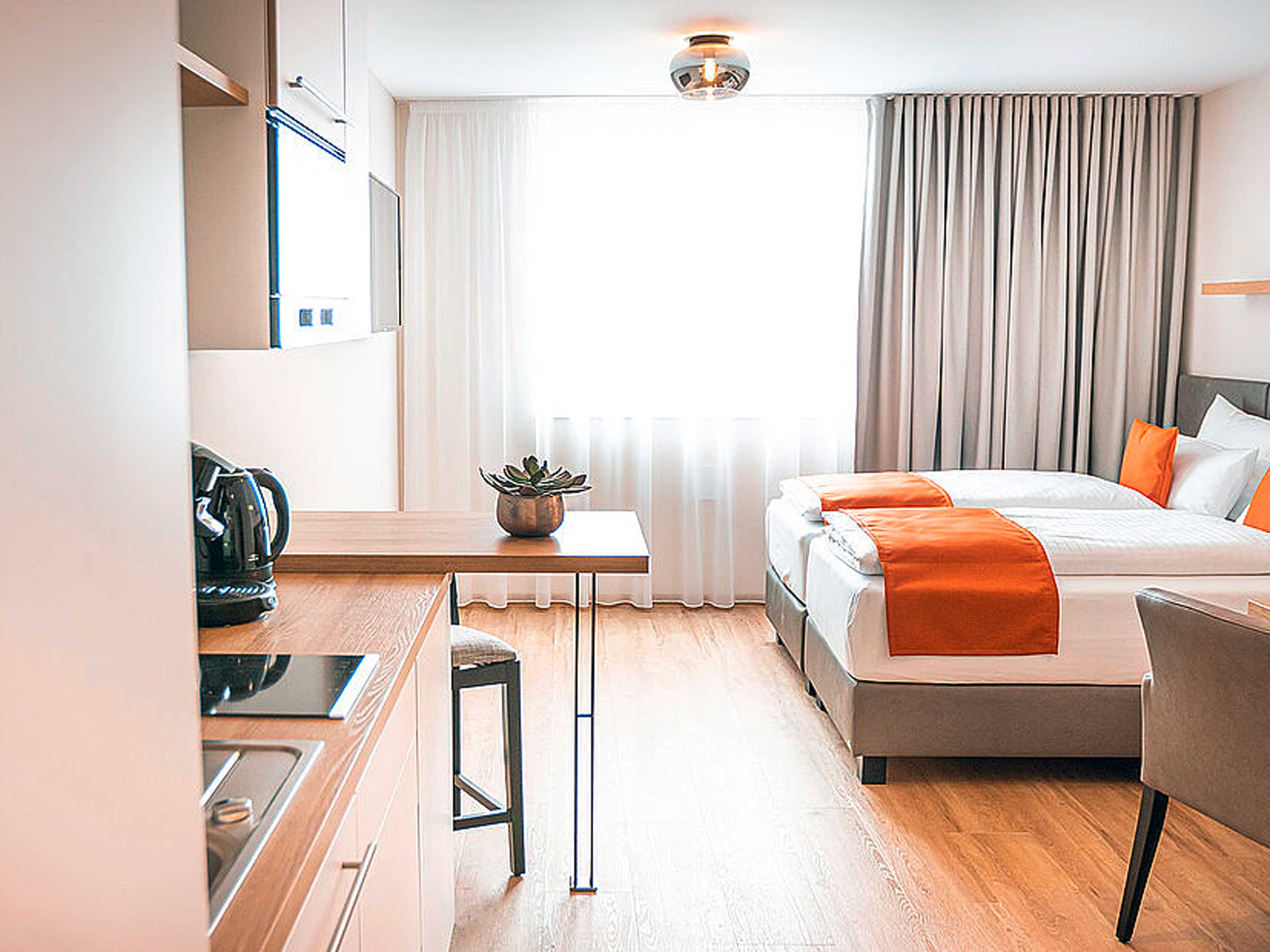 Gut und günstig schläft es sich im 2020 eröffneten, überaus freundlichen Apartment-Hotel Bodenseezeit fünf Kilometer von der Insel Lindau entfernt in Lindau-Zech. Familienzimmer mit kleiner Küche ab € 120.—, Frühstück € 12.—/p.P.