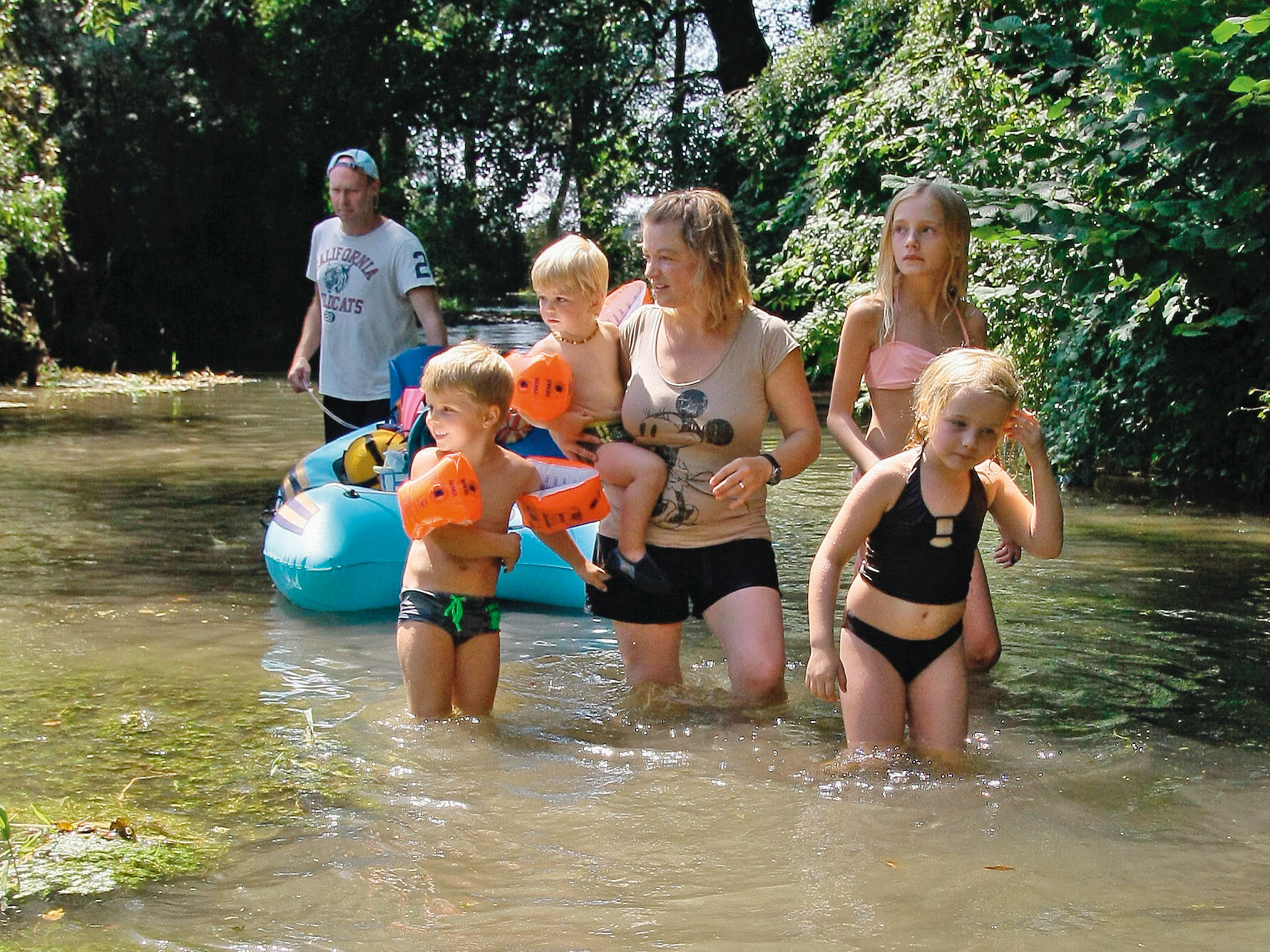 Das Gepäck transportieren wir per Gummiboot auf dem Limpach zu unserem Abenteuer-Waldrastplatz. Der Bach ist etwa neun Meter breit und hat verschiedenste Untiefen. Manchmal ist das Wasser nur knöcheltief, dann reicht es wieder bis über unsere Hüften. Malin, 6, gruselt sich vor den fiesen Schlingpflanzen, die sich heimtückisch von hinten um unsere Waden schlängeln. Panisch kreischend schüttelt sie sich dieses «widerliche Zeugs» vom Bein, fuselt sich aber bald, mit angeekelter Mimik, die Schlamm- und Schlingdinger mit zwei Fingerspitzen von den Waden, ganz ohne schrille Schreie. Wir geniessen die Kühle des Baches in der Hitze dieses Hitzesommers 2015, die Natur, die Ruhe – bis Mikka in ein tiefes Loch stolpert, nur der Kopf guckt noch raus. Sie schreit, ausser sich vor Schreck, und dann, als sie wieder Boden unter den Füssen hat, vor Wut: «So ein Scheissbach, so was mach ich nie wieder, ich geh raus. Sofort!»