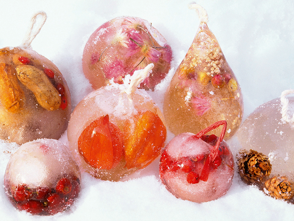 Bastel-Giessformen aus Kunststoff mit Einfüll-Loch aus dem Bastelhandel: verschieden grosse Kugeln oder Tropfen, Materialien aus dem Garten wie Samen, Früchte, Nüsse, Zapfen, letzte Beeren, Wollfaden fürs Aufhängen, Wasser, Temperaturen unter Null oder Tiefkühlfach