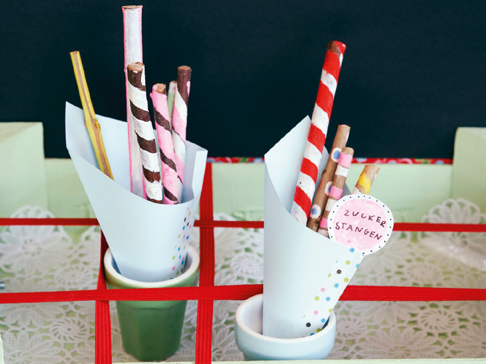 3 Aus Papier eine Tüte falten und «Zuckerstangen » arrangieren. Nun gehts los mit «verkäuferle».