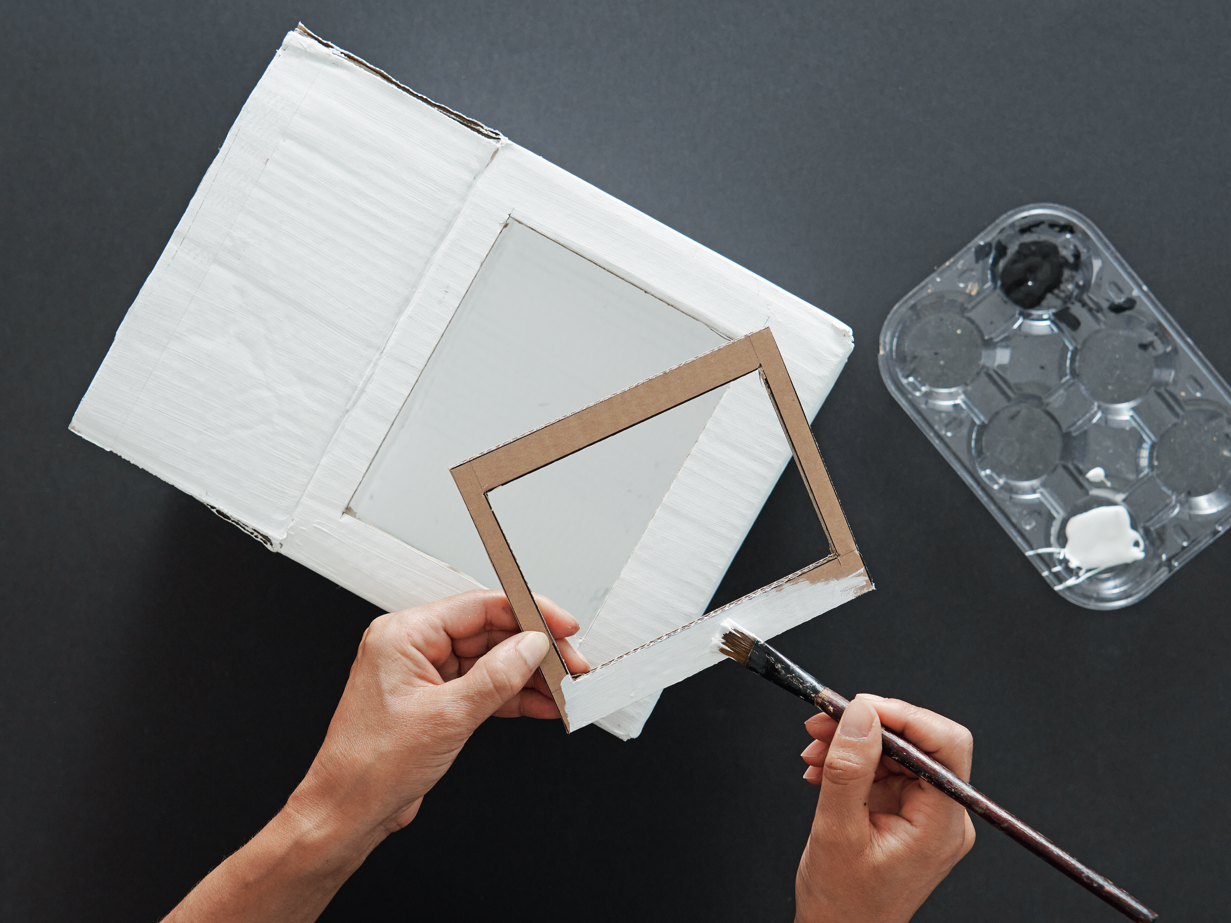 2 Alle Kartonteile auf beiden Seiten mit weisser Acrylfarbe bemalen.