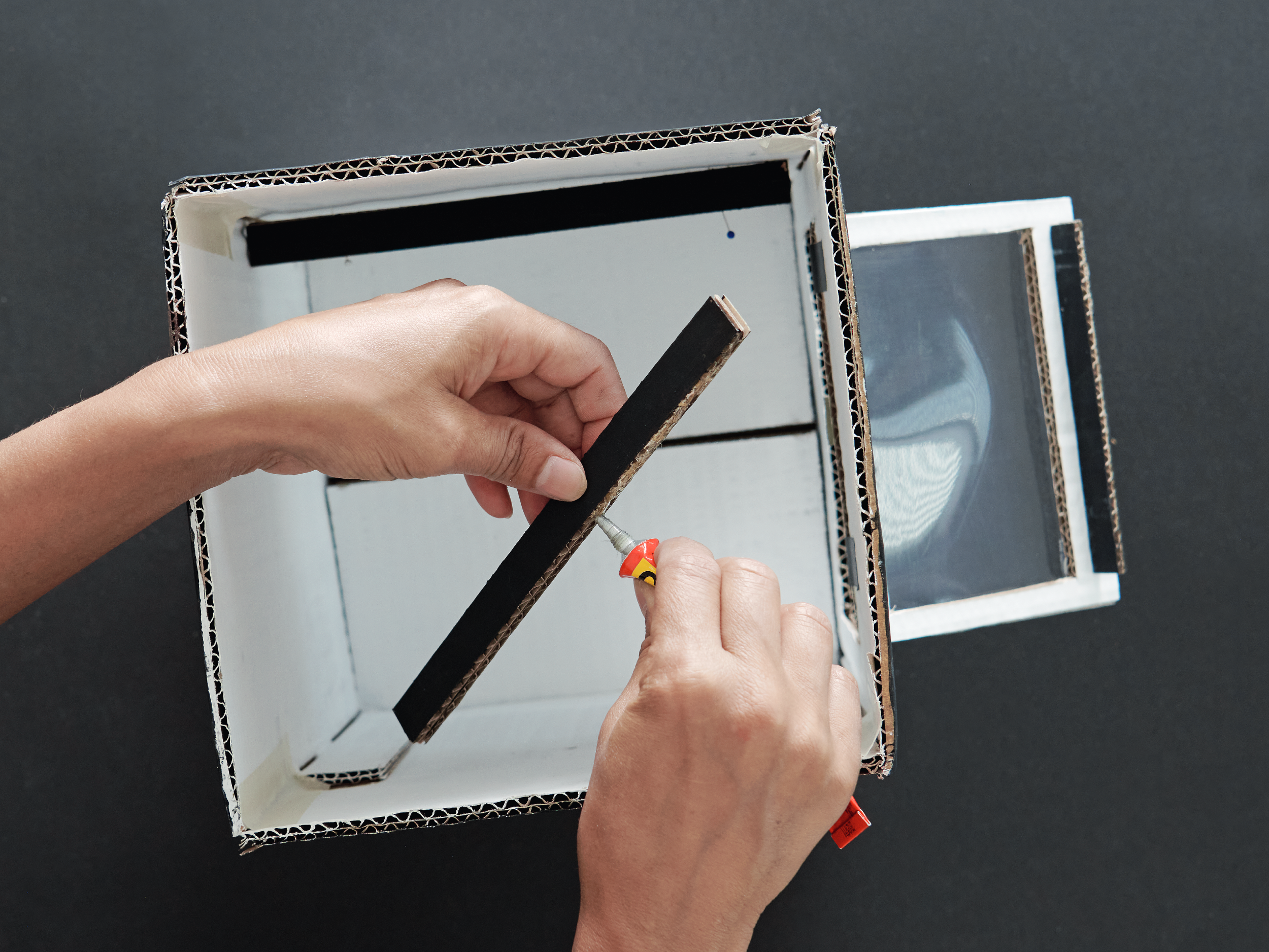 1 Kartonkiste unten öffnen. Backofentüre einzeichnen. Im ausgeschnittenen Karton-Rechteck wird für das Backofenfenster nochmals ein Rechteck eingezeichnet, sodass ein dicker Rahmen entsteht. Dieses Rechteck ebenfalls ausschneiden.