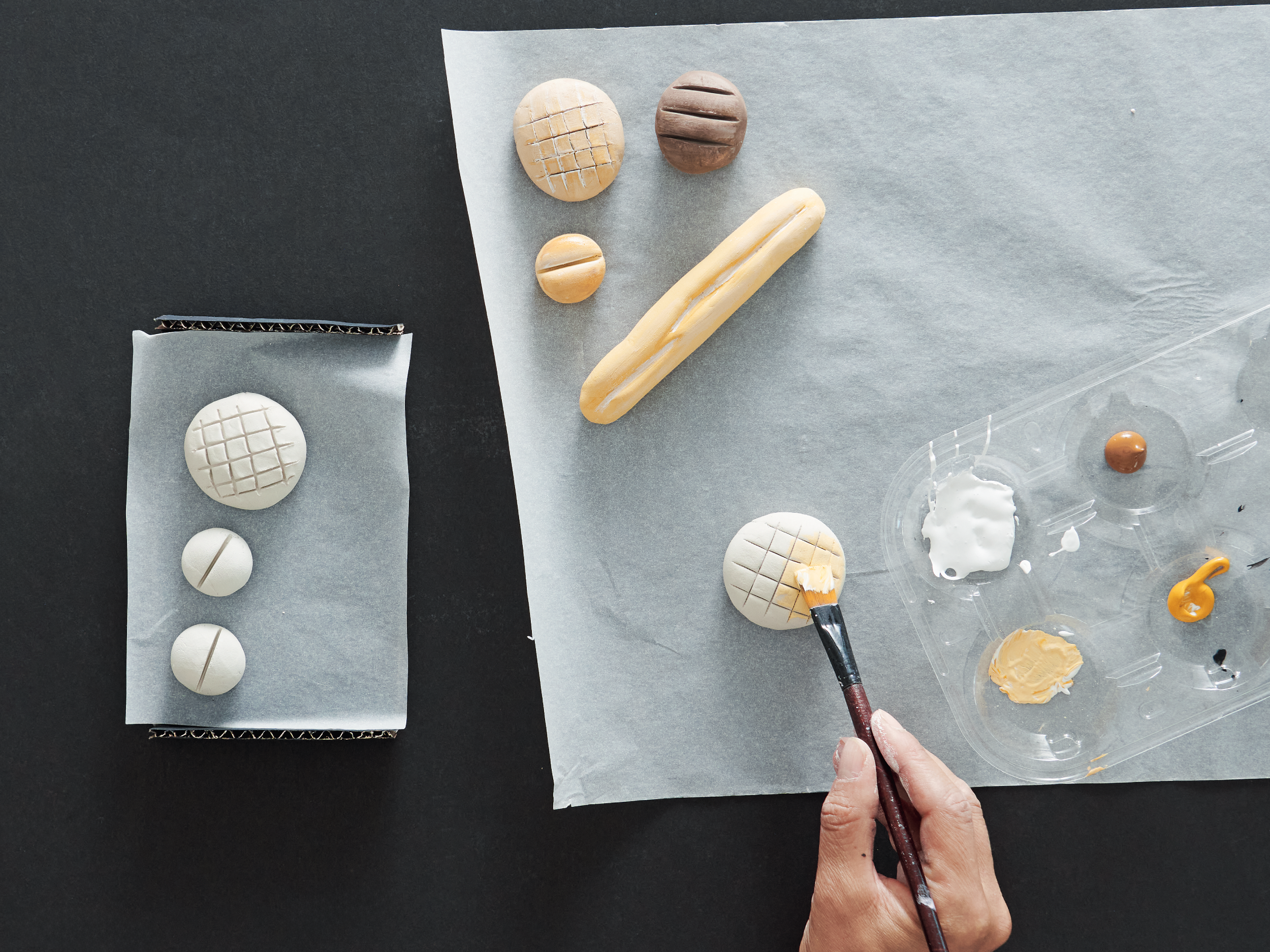 8 Die trockenen Brote mit Acrylfarbe bemalen. Damit sie echter aussehen, die Ritzen mit hellerer Farbe bepinseln.