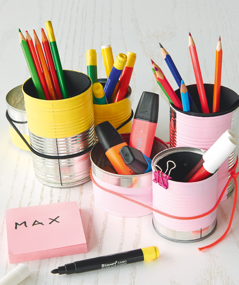 Verschieden grosse Büchsen mit Acryllack bemalen – Streifen rundherum, horizontal und diagonal. Gut trocknen lassen, mit Stiften und Bastelutensilien bestücken und mit einer Gummikordel zusammenbinden – und fertig sind die Stifthalter für unsere kleinen ABC-Schützen.