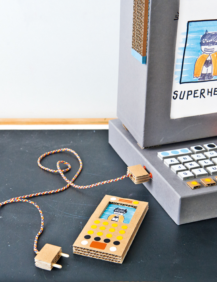 Für «Stecker» 6 gleich grosse Karton-stückchen zuschneiden, je 3 verleimen. Schnurenden dazwischen kleben. 4 Spiesse zuschneiden und im Stecker mit Leim fixieren. Passende Löcher am Compi und Telefon anfertigen.