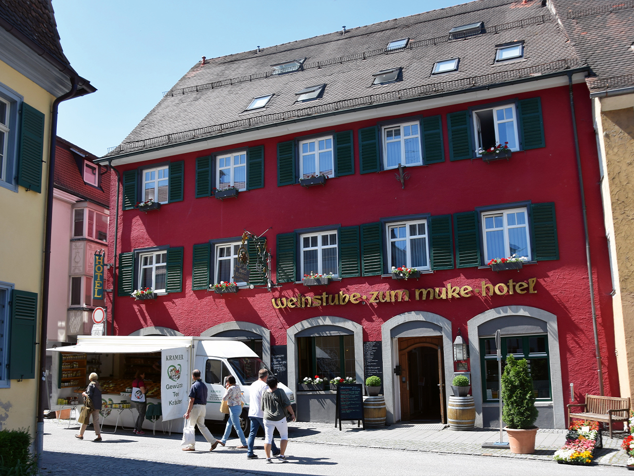 Das Hotel Residenz – Weinstube zum Muke liegt mitten in der Altstadt, sodass man zu Fuss alles erkunden kann. Das historische Hotel mit seiner roten Fassade sieht wunderbar schwäbisch aus, bietet geräumige Zimmer, anständige Preise – und natürlich leckeren Wein aus der Region.