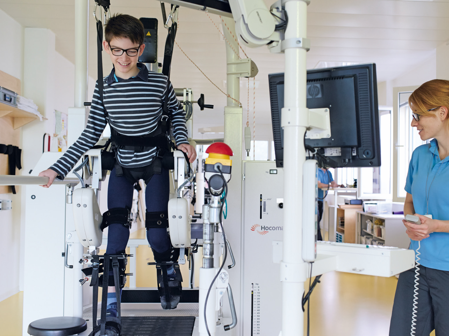Bei dem Stichwort «Reha» kommen einem automatisch Senioren in den Sinn. Rehabilitation nach Herzinfarkt, Schlaganfall oder nach Hüftgelenks-OP. Dass auch Kinder und Jugendliche mitunter spezielle Therapien brauchen, um verlorengegangene Fähigkeiten wiederzuerlernen, ist vielen nicht bewusst. Im Rehabilitationszentrum, das vor den Toren Zürichs steht und zum Zürcher Kinderspital gehört, betreuen Therapeuten, Pflegende und Ärzte bis zu 47 junge Patienten rund um die Uhr. Die Kinder kommen aus allen Landesteilen und manchmal sogar aus dem Ausland. Wer nach Affoltern verlegt wird, hat oft einen langen Spitalaufenthalt hinter sich. Ein Drittel der Reha-Kids leidet an den Folgen eines Unfalls, ein Drittel hat eine akute Erkrankung hinter sich und das letzte Drittel ist chronisch krank oder behindert. «Es ist nicht entscheidend, welche Diagnosen die Patienten mitbringen», sagt Andreas Meyer-Heim, der ärztliche Leiter der Einrichtung. «Uns interessiert vor allem, was die Mädchen und Jungen zum Zeitpunkt ihres Eintritts können und welche Ziele wir gemeinsam setzen.» Manche Kinder müssen erst wieder das Schlucken lernen, andere können kaum noch sprechen. In vielen Fällen ist die Reha vor allem ein Kampf gegen die Schwerkraft. Sich aufsetzen, sitzen bleiben, aufstehen, laufen – all das sind komplexe motorische Abläufe, die gerade bei Schädel-Hirn-Verletzungen häufig in Mitleidenschaft gezogen werden. Die gute Nachricht: Ein Teil der bereits verloren geglaubten Fähigkeiten kann durch massgeschneiderte Reha-Therapien reaktiviert werden. Das braucht viel Geduld und es gibt keine Garantien. Kleinere Wunder geschehen in Affoltern jedoch täglich. Wenn ein Meilenstein geschafft ist, dann fühlt sich das für die Kinder an, als hätten sie fliegen gelernt. Aus dieser Perspektive betrachtet ist Felix nicht etwa in einer Reha-Klinik, sondern in einer Kinderflugschule.