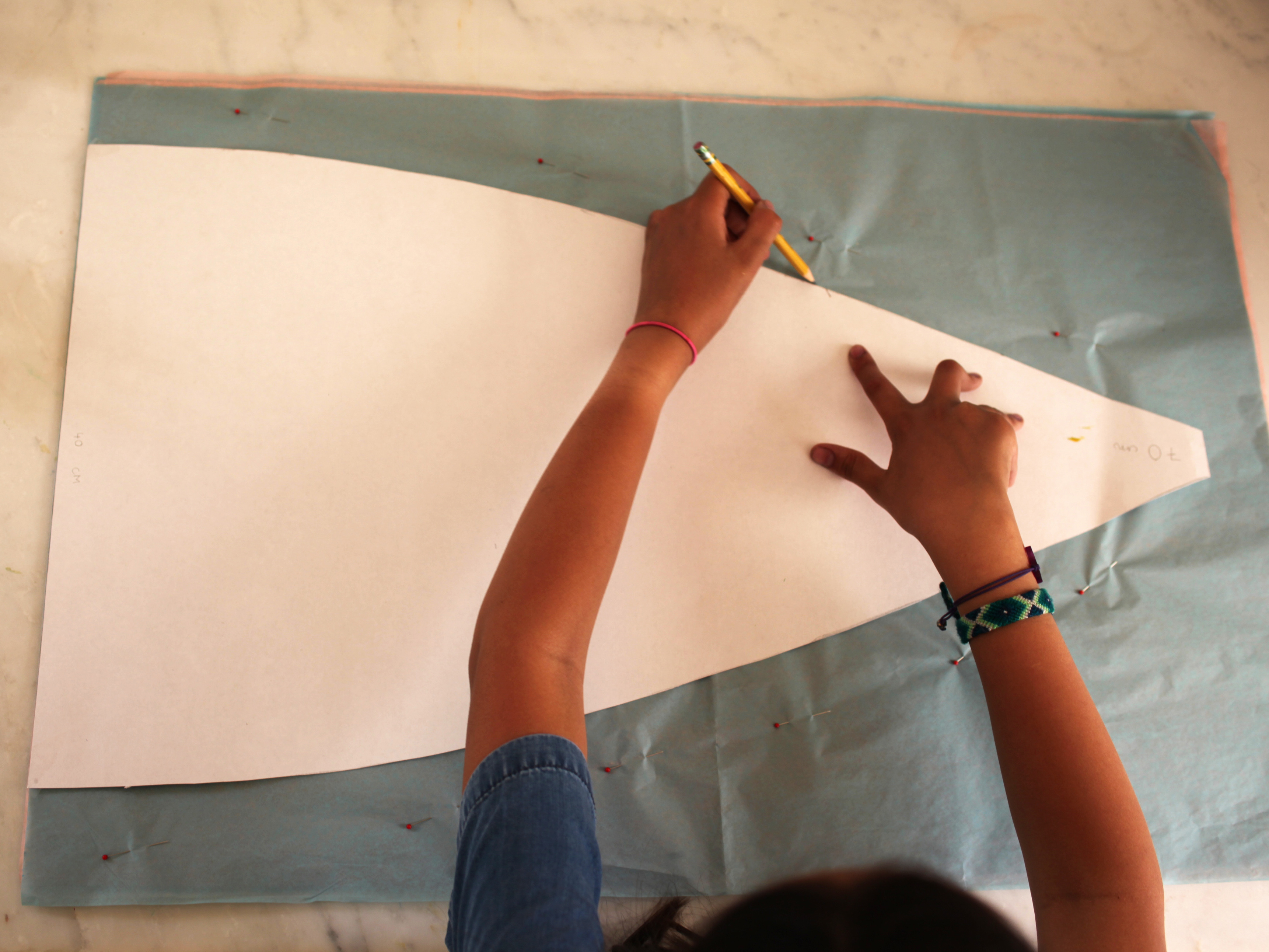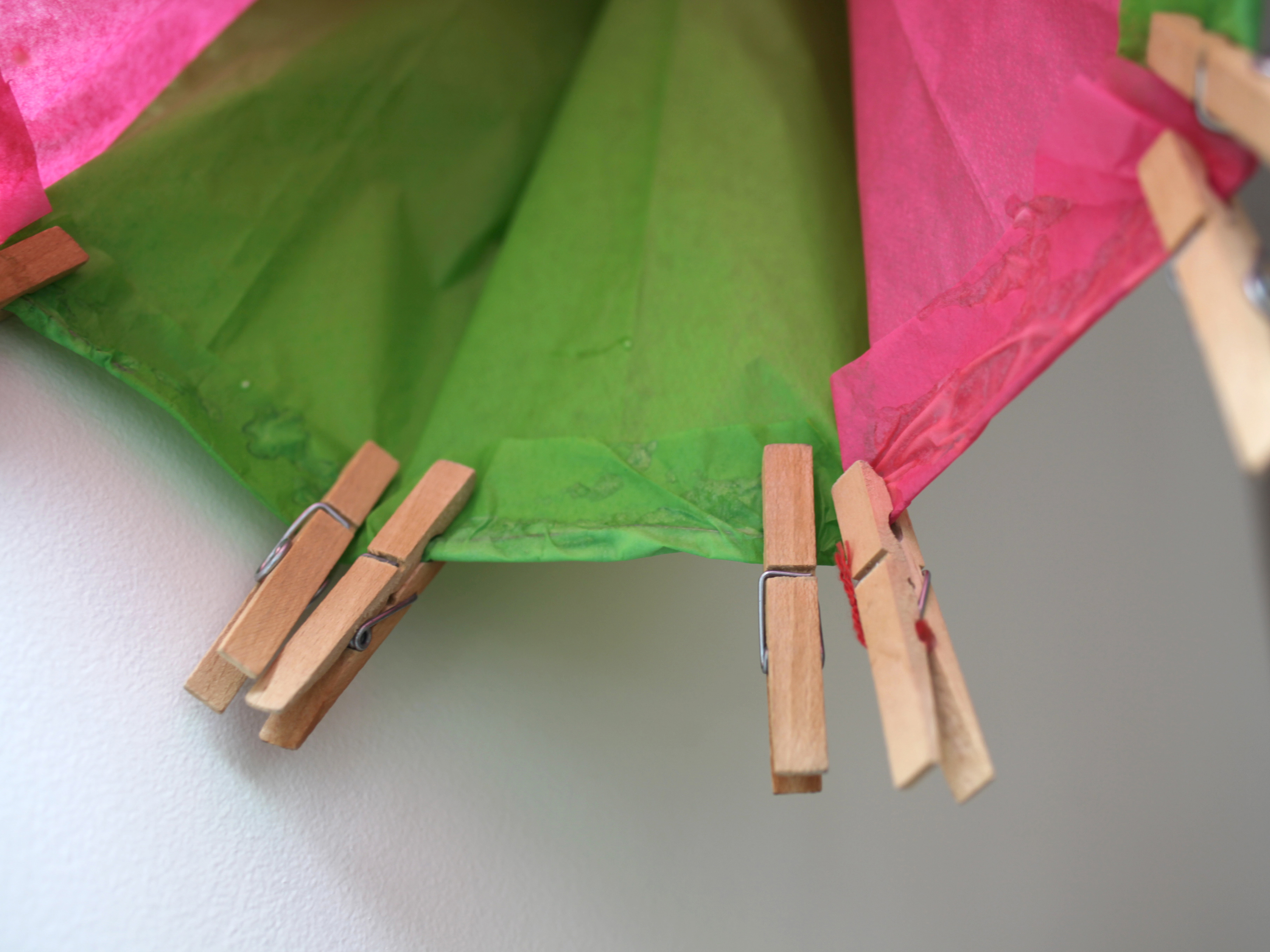 Während des Trocknens Wäscheklammern zwischen die Arbeitsfläche und das Seidenpapier legen, damit das Papier nicht am Boden oder auf dem Tisch festklebt.