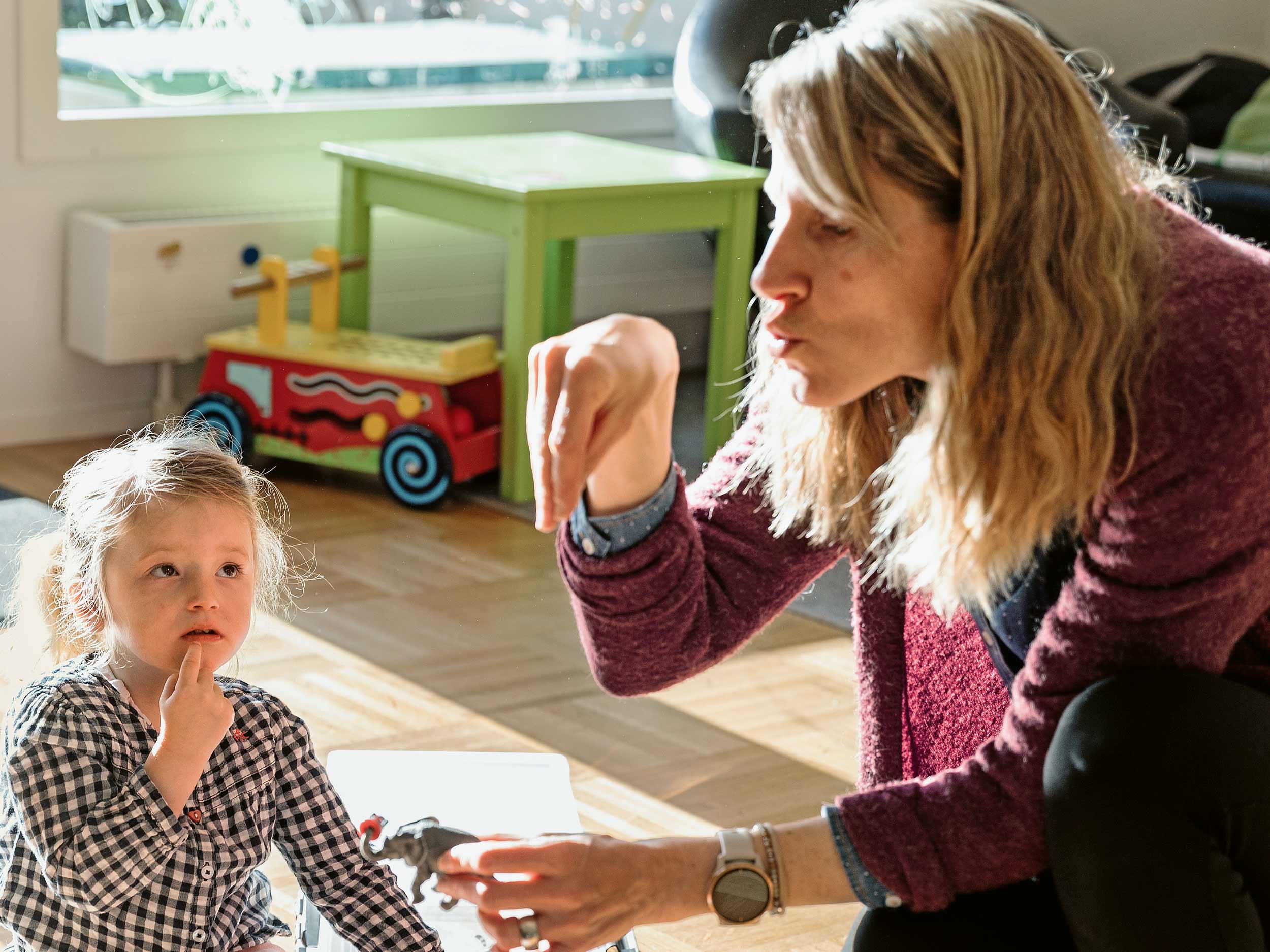 Auch Zoe ist alles andere als stumm. Sie ruft ihre Brüder – mit ganz leicht verwischtem Klang – beim Namen oder wehrt sich lautstark, wenn sie genug hat vom Memory-Spiel. Ihre Mutter Salome ist froh, dass ihre Kleine von den beiden Jungs schon früh kräftig «beschallt» wurde, wie sie es nennt. «Dadurch können wir für Zoe das Beste herausholen». Ob Zoe dereinst die öffentliche Schule besuchen kann, wird sich zeigen. «Ein bisschen Angst davor habe ich manchmal schon», sagt Salome, «ich hoffe, sie wird nicht gehänselt wegen ihrer nicht perfekten Lautsprache.»