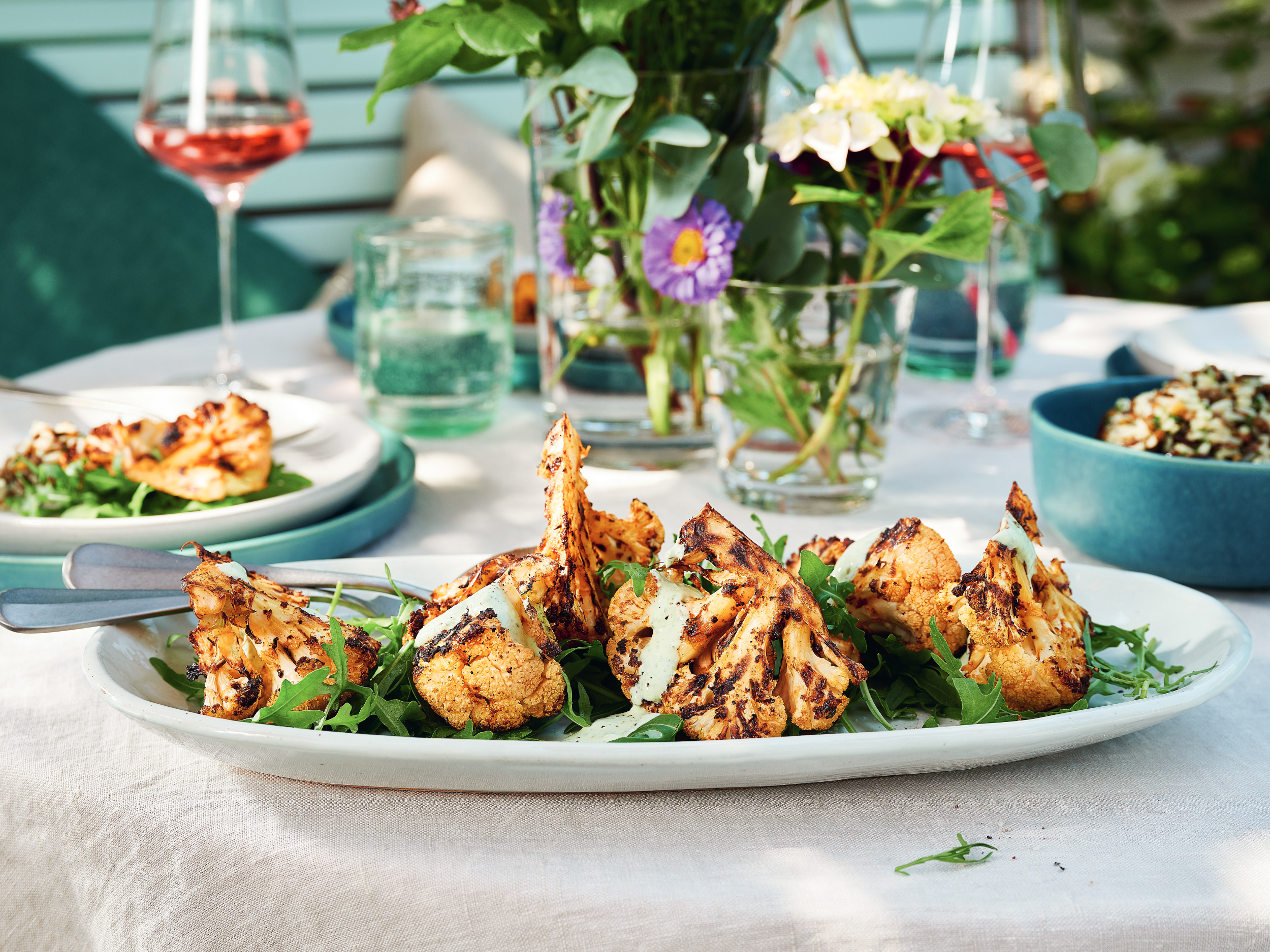 1 Vom Blumenkohl die Blätter entfernen und den Strunk leicht anschneiden, aber auf keinen Fall entfernen, denn der Blumenkohl soll noch gut zusammenhalten. Den Kohlkopf in etwa 8 Schnitze schneiden und auf eine grosse Platte legen. 2 Olivenöl, Paprika, Curry, Oregano, Zitronensaft, Salz und Pfeffer zu einer Marinade verrühren. Die Blumenkohlschnitze beidseitig damit bestreichen. 3 Den Blumenkohl auf dem Grill bei Mittelhitze (ca. 180 Grad) mit geschlossenem Deckel 12–15 Minuten grillieren; zwischendurch etwa zweimal wenden; der Blumenkohl soll noch leicht bissfest sein. 5 Mit Rucola oder Salat auf einer Platte anrichten und den Blumenkohl daraufsetzen.