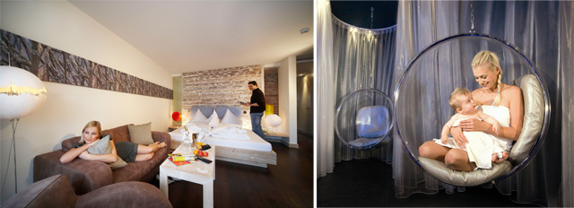 Das Essen, der Wein, die gepflegte und elegante Wellnessanlage. Da dürfen zu gewissen Zeiten auch die Kinder rein, um zu sehen, wo Mami und Papi ständig rumfläzen. Überdies eine schicke Winelounge, eine Bar und ein Weinkeller.