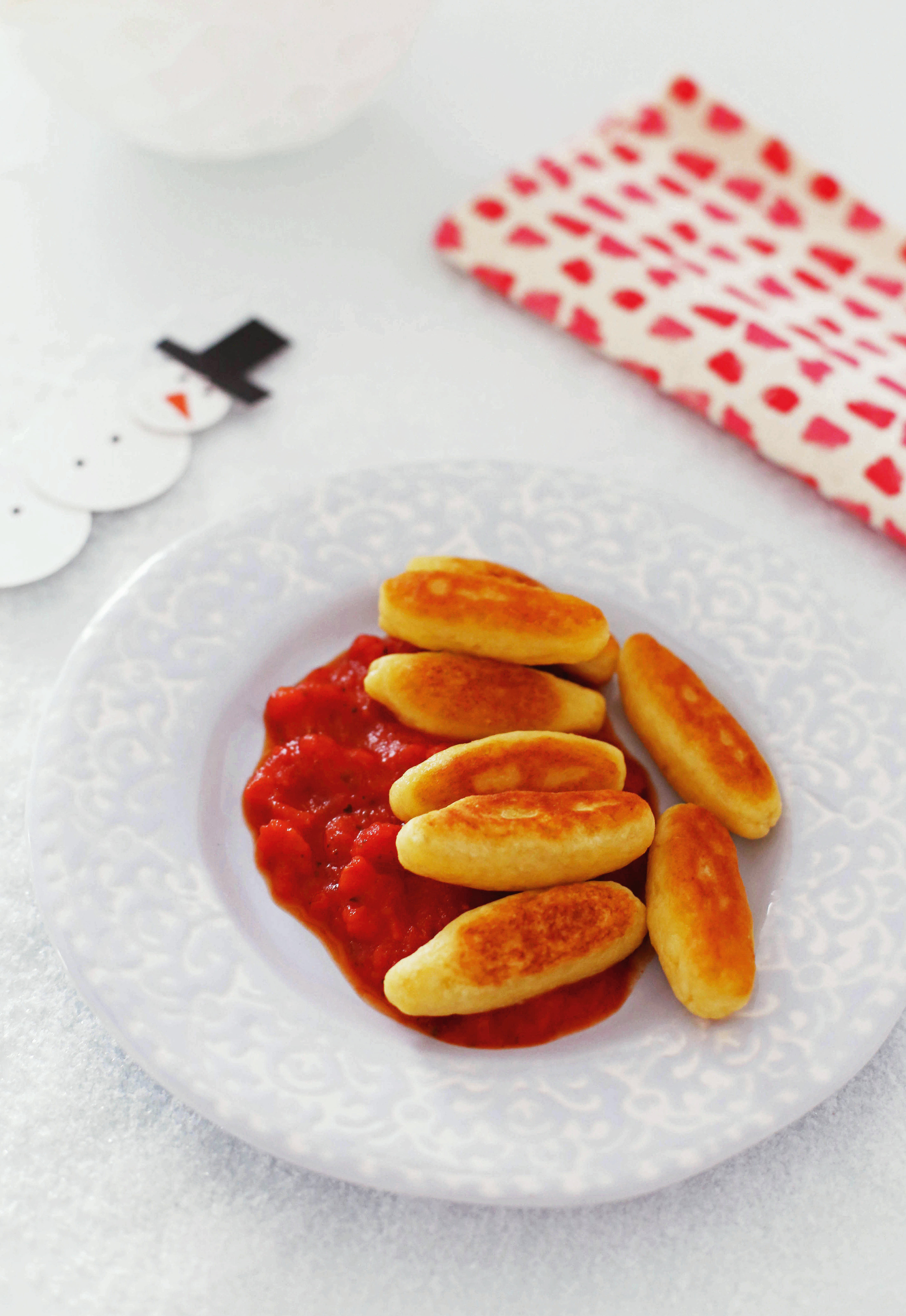 1 Für die Fingernudeln die Kartoffel am besten bereits am Vortag in reichlich Salzwasser weich kochen. Noch heiss schälen und durch ein Passevite drücken. Die Kartoffeln in eine Schüssel geben, mit Frischhaltefolie abdecken und abkühlen lassen. Am nächsten Tag das Mehl, Salz, Eier und etwas frisch geriebene Muskatnuss dazugeben. Alles von Hand zu einem Teig verarbeiten. Solange er noch klebt, immer wieder etwas Mehl dazugeben, bis er geschmeidig ist. Die Arbeitsfläche mit Mehl bestäuben, die Kartoffelmasse zu einer etwa 5 cm dicken Rolle formen und kleine Stücke abschneiden und von Hand zu kleinen, fingergrossen Nudeln formen.