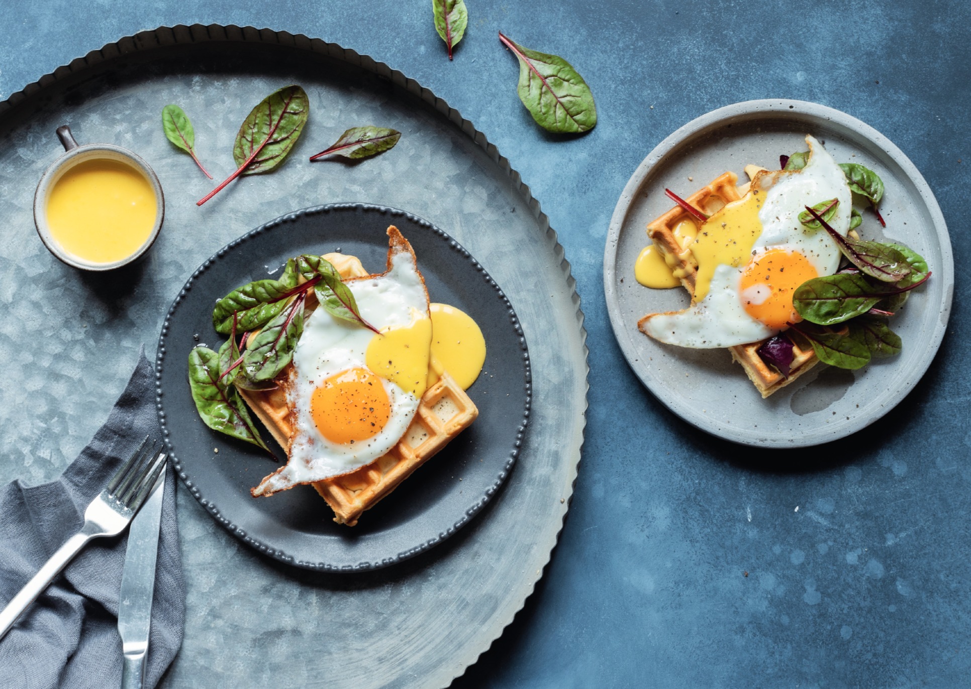 6 Die Waffeln mit den Spiegeleiern anrichten, Sauce darüber geben, den Salat daneben platzieren, sofort servieren.