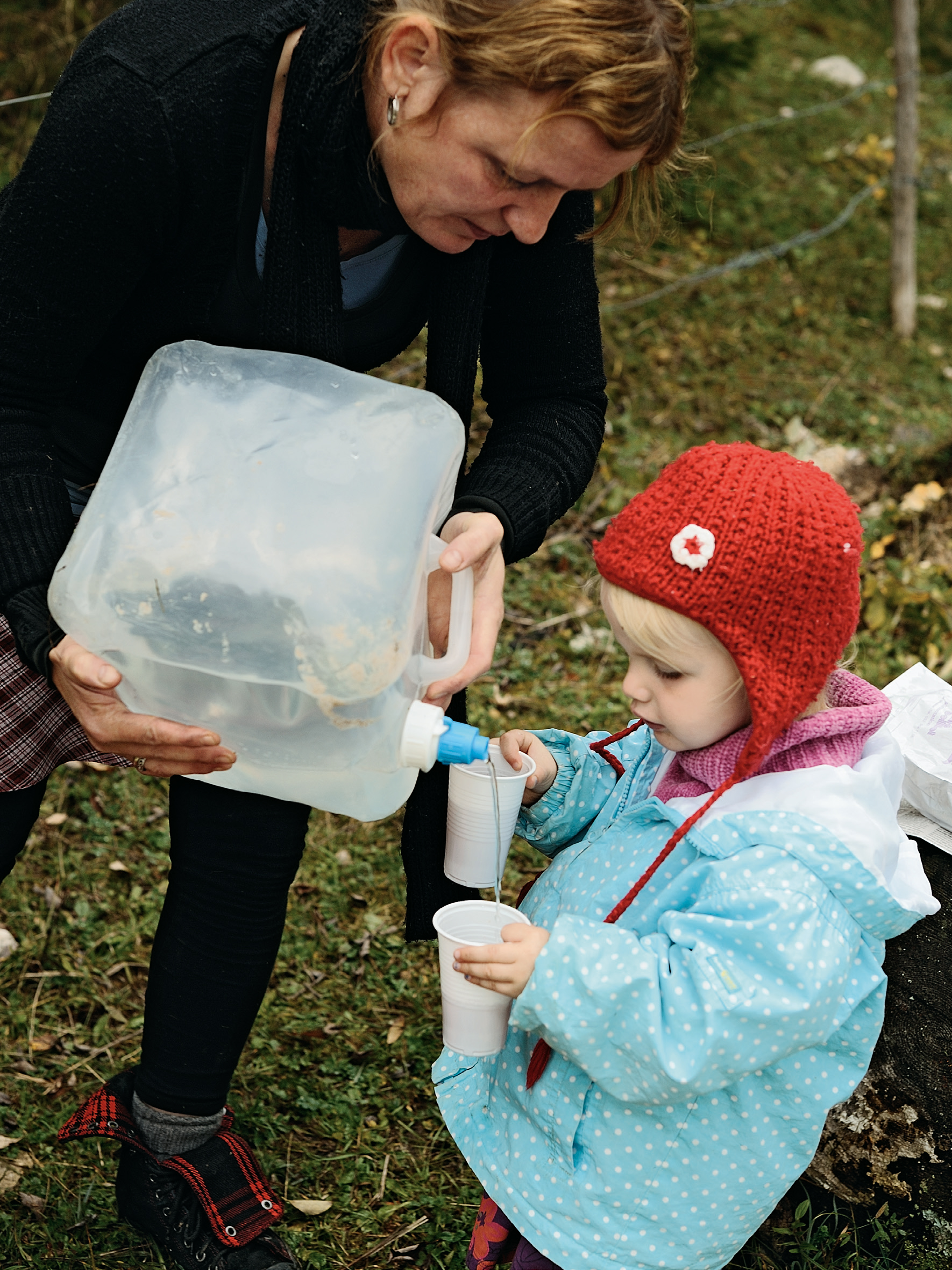 Mittags sammeln wir Holz fürs Feuer, braten Würste und essen aus dem Rucksack. Mikka sitzt bei Vulcain, füttert ihn mit Heu, hält den Wasserkessel hin, krault ihn, flüstert ihm ins Ohr und isst ihre Wurst. Wir anderen machen es uns um das Feuer gemütlich. Bei den Herbergen, wo wir übernachten, steht jeweils eine Pferdebox für Vulcain bereit. Und auch hier müssen wir als Team funktionieren, wir arbeiten Hand in Hand: Die Männer spannen das Pferd vom Wagen, reiben Vulcain den Schweiss vom Rücken und kratzen den Dreck aus den Hufen; Mikka striegelt und füttert ihn, und Malin und ich streuen frisches Stroh in die Box. Obwohl wir alle mitarbeiten, dauern diese Arbeiten jedesmal rund eineinhalb Stunden, morgens und abends. Erst wenn sich Vulcain in seiner Box breit macht, ist auch für uns Feierabend.