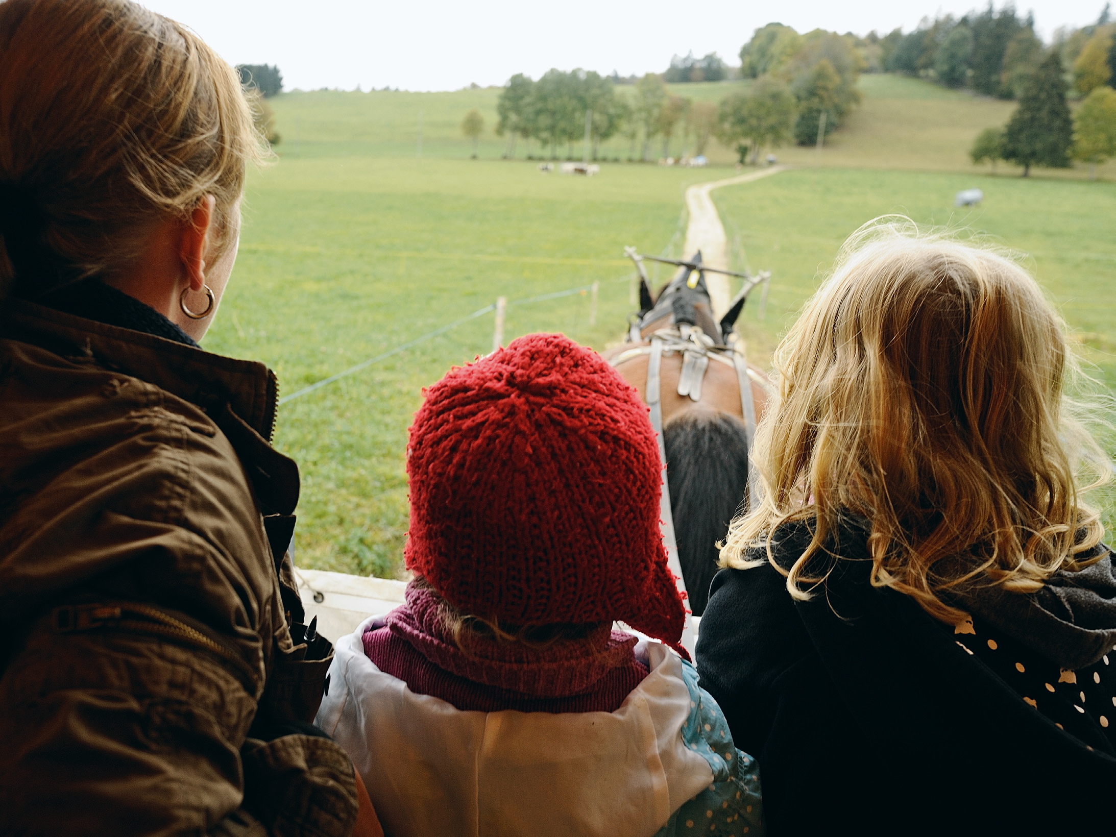 In unsere Körper dringt jetzt nicht mehr die Kälte; es ist die Ruhe, diese absolute Stille, die sich breit macht, ausdehnt, zufrieden macht. Nichts tun, keine Termine, keine Verpflichtungen. Einfach Zeit. Wir sitzen auf dem Bock oder gehen hinter dem Wagen und neben dem Pferd her. Der raue, schleppende Groove von Vulcains Hufen, das kratzige Klatschen auf der Strasse, klack, klack, geben den Rhythmus, den Sound. Es ist die Langsamkeit, die Unaufgeregtheit, die uns erfasst, uns still macht. Wir diskutieren oder reden nichts. Wir sind. Entschleunigt. Selbst Malin ist still und zufrieden. Trotz der Tatsache, dass sie die gesamte Fahrzeit auf dem Wagen verbringen muss. Denn zu Fuss hätte sie nicht mithalten können, das Pferd läuft relativ schnell. Nun sitzt sie mal vorne bei Mike auf dem Bock, die Zügel in den Händen und spielt Kutscherin, oder sie lässt sich hinten im Wagen auf einem der schmalen Holzbänke von Papa Geschichten erzählen. Die Kinder freuen sich über die Zeit, die wir Eltern für sie haben.