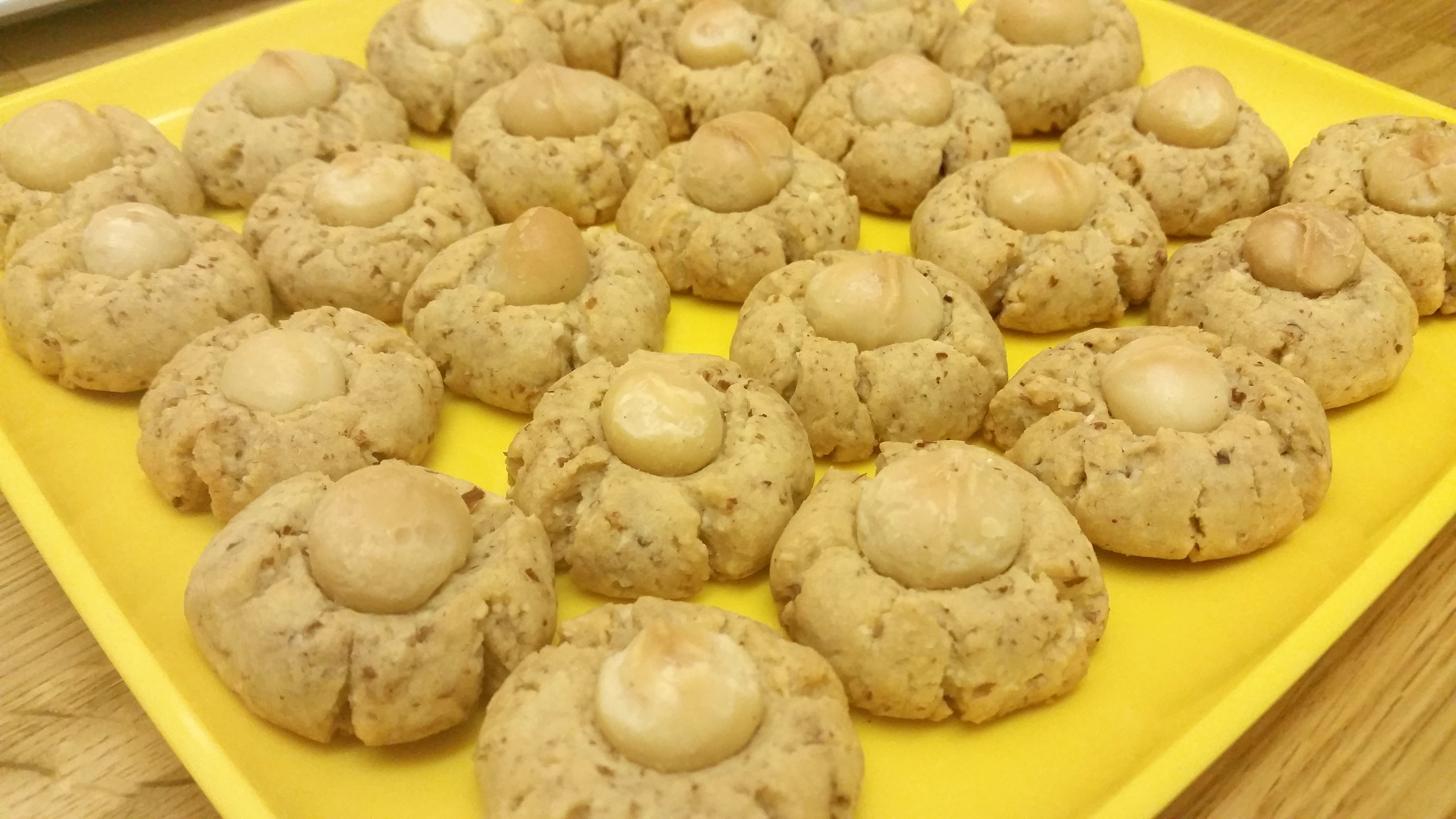 Nussgrosse Kugeln formen, in die Mitte je eine Macadamia-Nuss eindrücken.