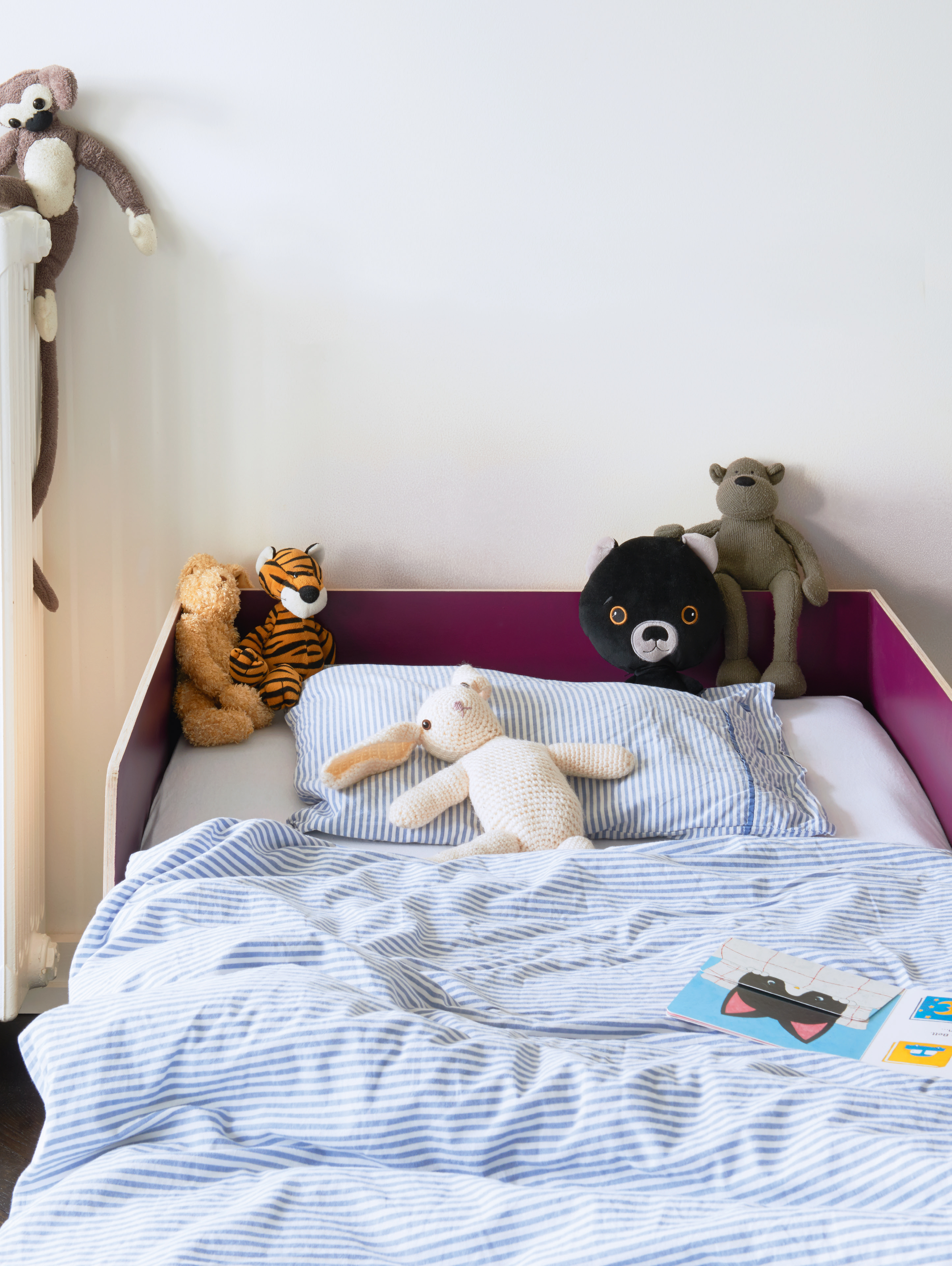 Material: Dreischichtplatten vom Babybett wiederverwenden oder drei neue Platten für die Umrandung zuschneiden lassen (nicht vergessen: Materialdicke abziehen), 8 mm dickes Sperrholz für Boden unter der Matratze, Holzschrauben, Acrylfarbe