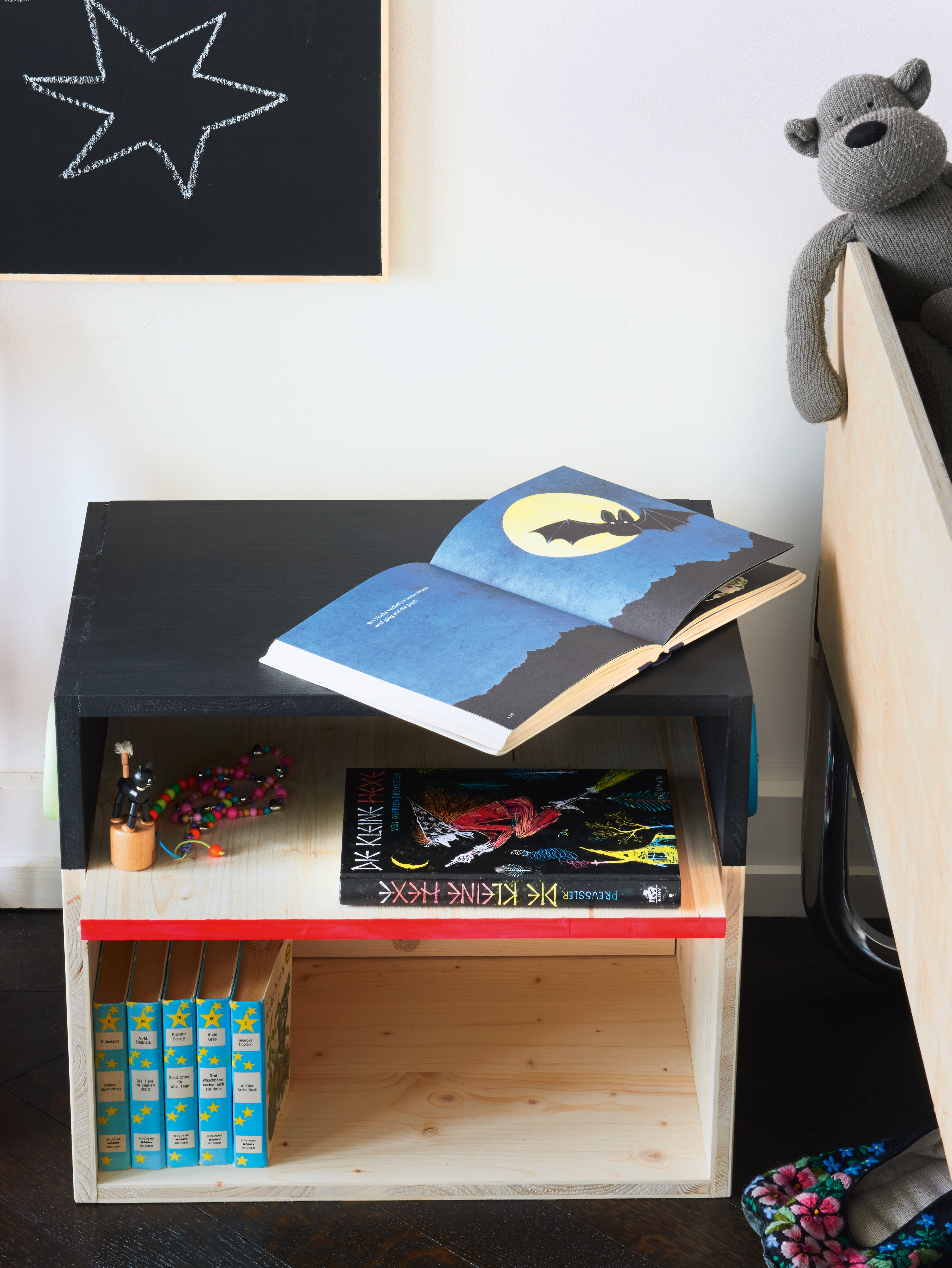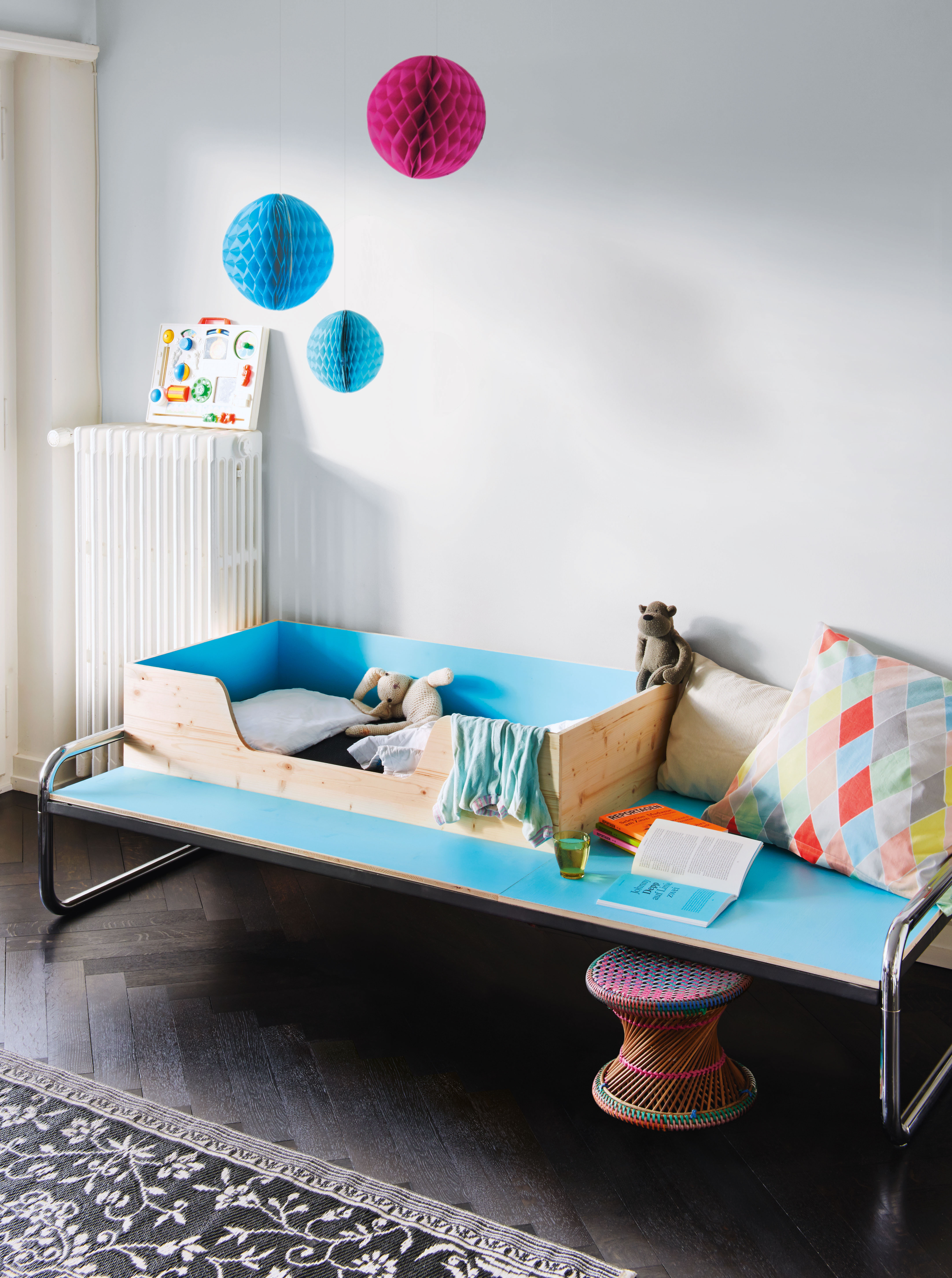 Material: 90/200 cm Bettgestell, Babymatratze, vier Dreischichtplatten von 15 mm Dicke. Grösse der Platten der Babymatratze anpassen. Metallwinkel, Holzschrauben, Acrylfarbe, Holzleim