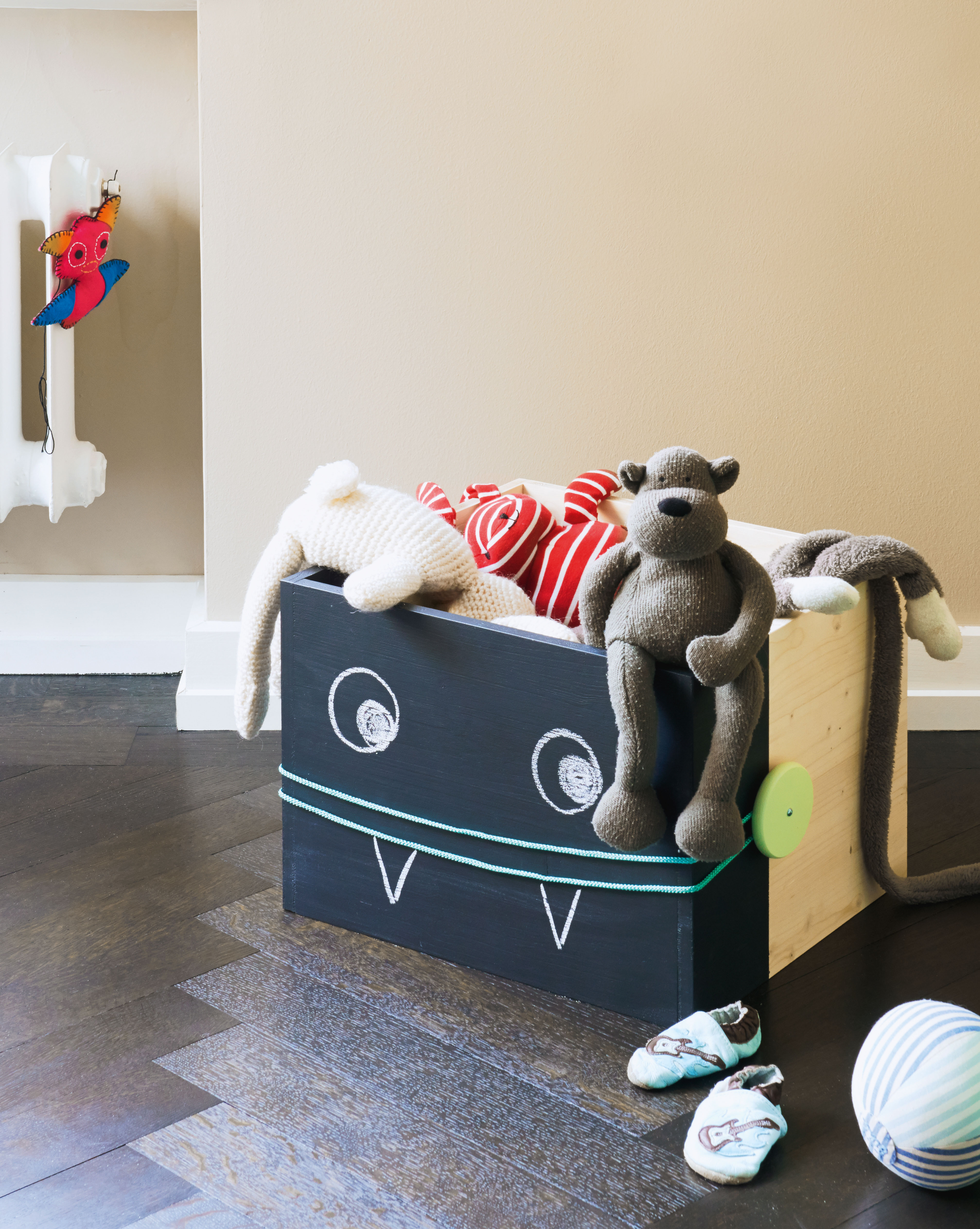 Material: Dreischichtplatte 15 mm Dicke oder eine bestehende Holzkiste, Wandtafelfarbe, 2 Holzräder (als Ohren), 2 kleine Holzperlen, Schrauben, Holzleim, Kordel, Möbelfilzli