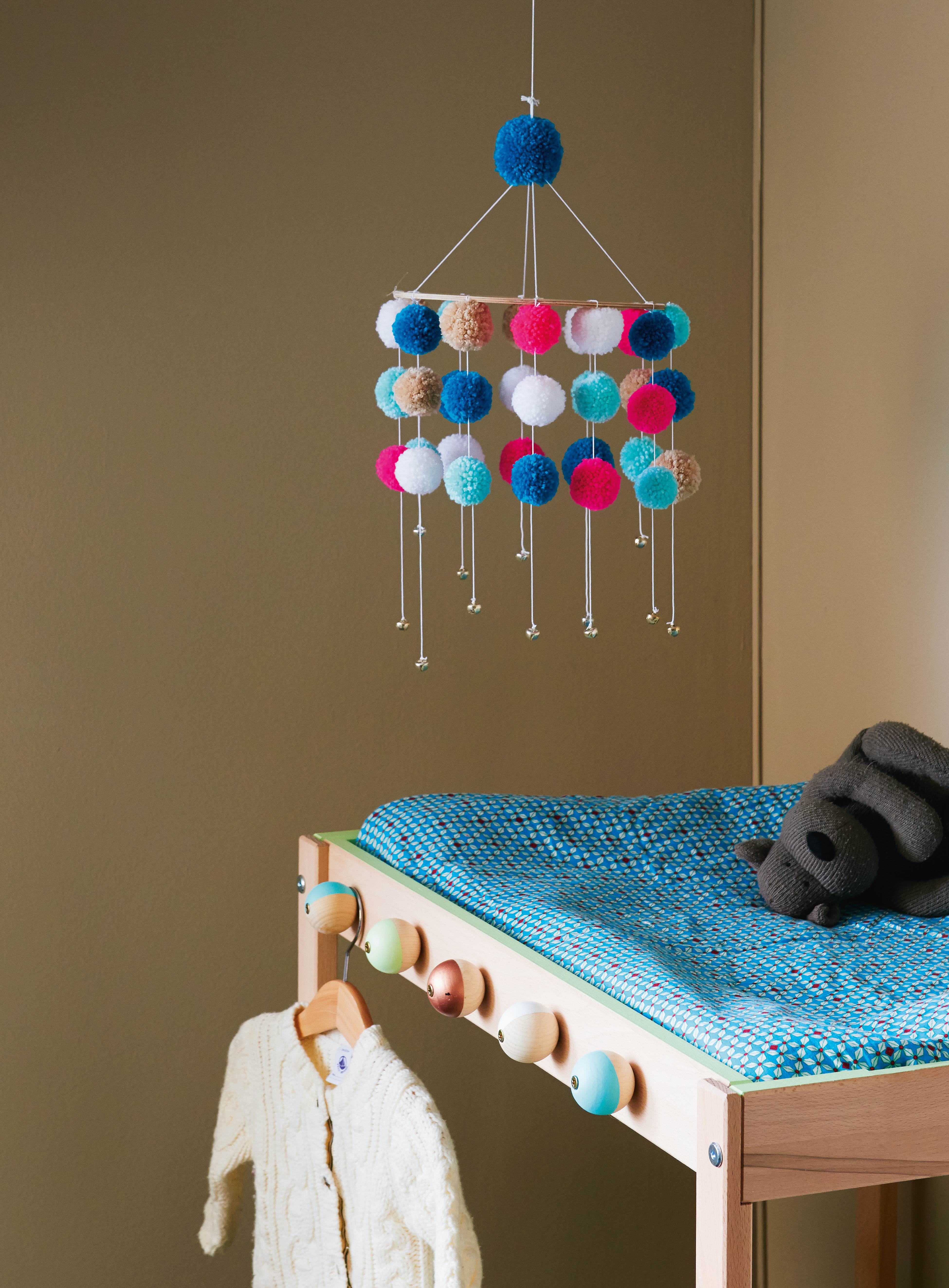 Werkzeug: Stift und Meter, Schere, Pompon-Set (erhältlich in den meisten Mercerie-Abteilungen oder Bastelläden), Akkubohrer, 3 mm Holzbohrer