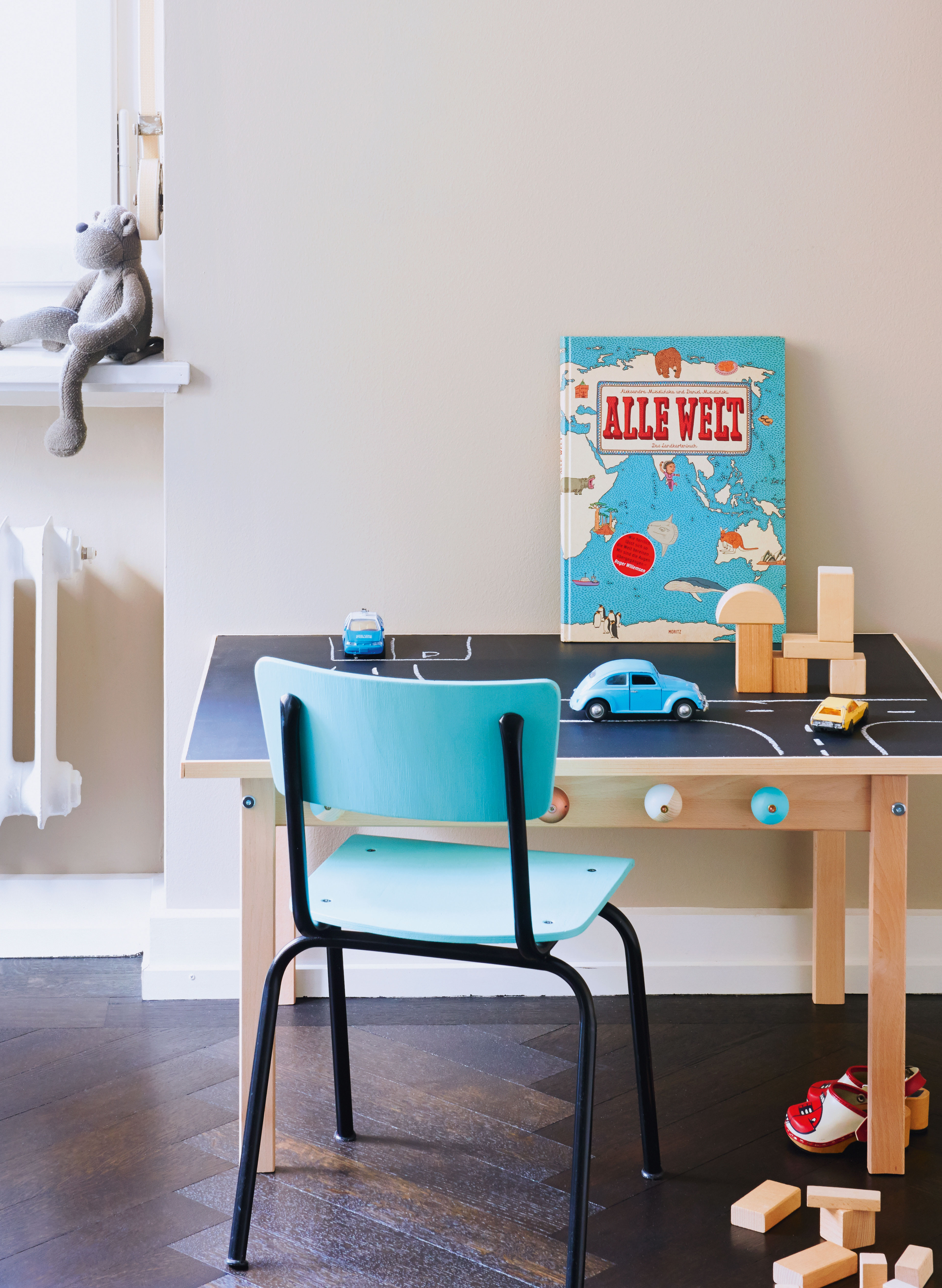 4 Flächen wie auf dem Bild gezeigt mit Wandtafelfarbe bestreichen. Vorher mit Abdeckband abkleben.