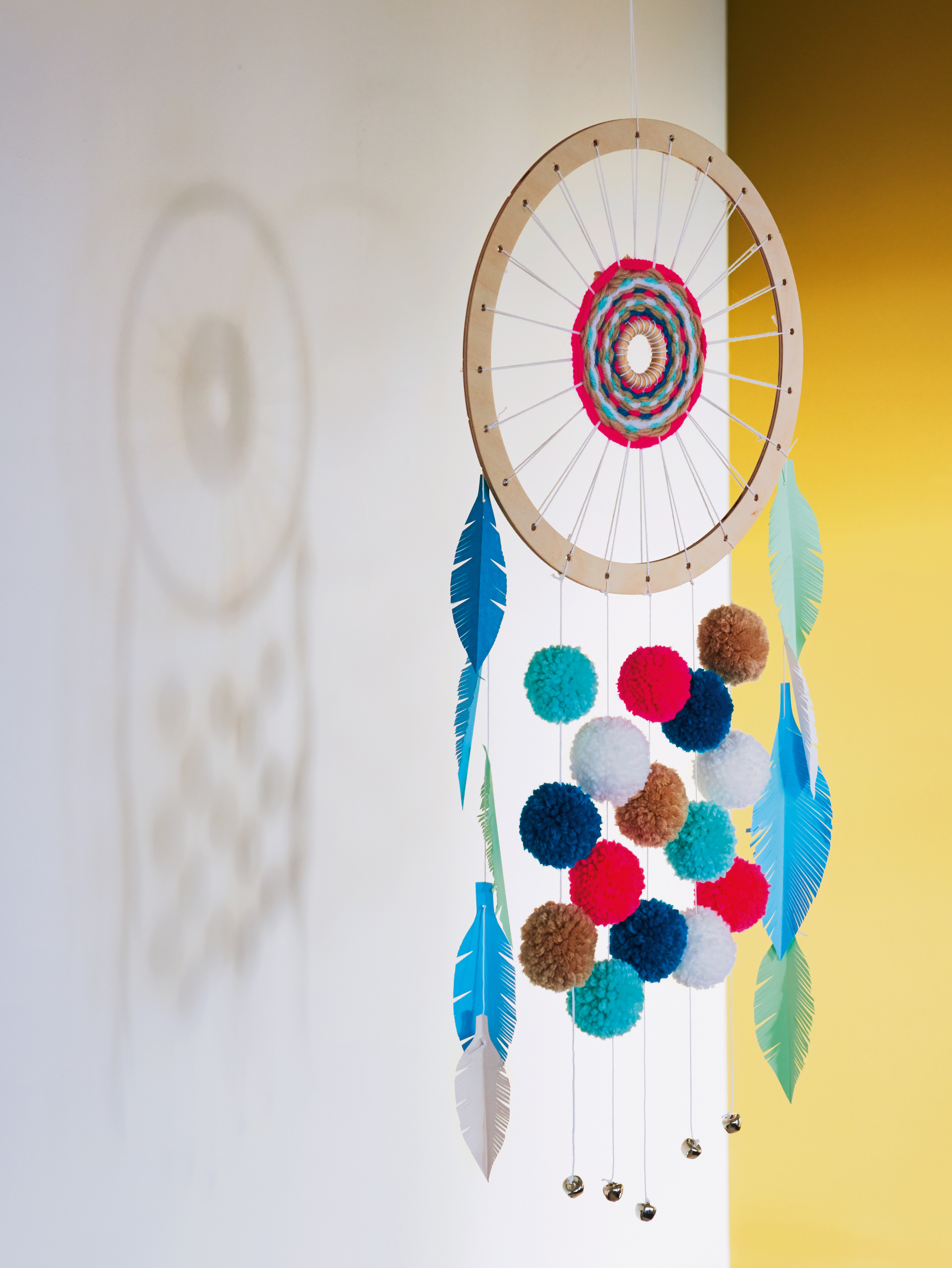5 Einen grossen Pompon anfertigen. Vier Garnstücke übers Kreuz am Holzreif anbringen und verknoten. Diese vier Fäden dann für die Aufhängung durch den grossen Pompon ziehen.