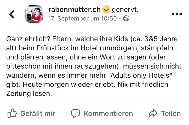 Ganz ehrlich? Ich finde das befremdlich und es fühlt sich an, als würden sich Eltern aus der Verantwortung ziehen. Wir sind nun einmal alle Teil dieser Gesellschaft und meine Freiheit hört da auf, wo deine anfängt. Und die fängt vielleicht in einem schönen Hotel an, wo du deine Zeitung beim Frühstück in Ruhe lesen möchtest, ohne über längere Zeit (wir reden hier von über einer halben Stunde quengeln) dabei gestört wirst, bloss weil die Eltern ihre Kinder nicht zurechtweisen.