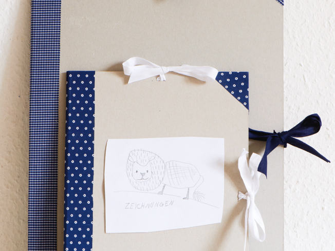 5 Stoffrechtecke um Mappenecken kleben und mit dem Japanmesser Schlitze für Bänder anbringen. Danach die Bänder von vorne durch die Schlitze ziehen und auf der Innenseite mit Stoffquadraten verkleben.