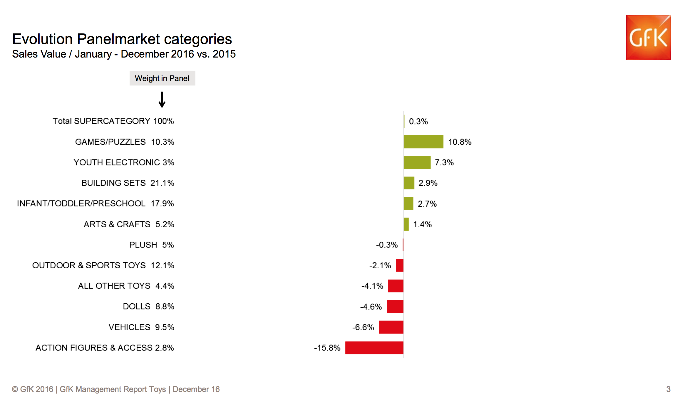 Im Bereich der Jugendelektronik halten Technik und Digitalisierung jedoch Einzug: Der Bereich ist um 7,3 Prozent gewachsen. Nach einem sehr starken Verkaufsjahr 2015 waren vergangenes Jahr hingegen Spielaktionsfiguren weniger gefragt: Der Verkauf war um 15,8 Prozent rückläufig.