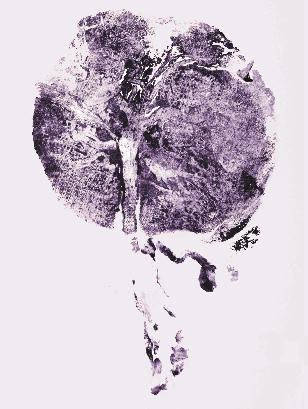 Kunstdruck: an die Wand Man lege die Plazenta auf eine glatte Unterlage, mit der Seite, die dem Baby im Bauch zugewandt war, nach oben und drücke ein Blatt saugfähiges Papier darauf, bis ein blutigschöner Abdruck entsteht. Wahlweise kann die Plazenta vorher gewaschen und mit Acrylfarbe eingepinselt werden.
