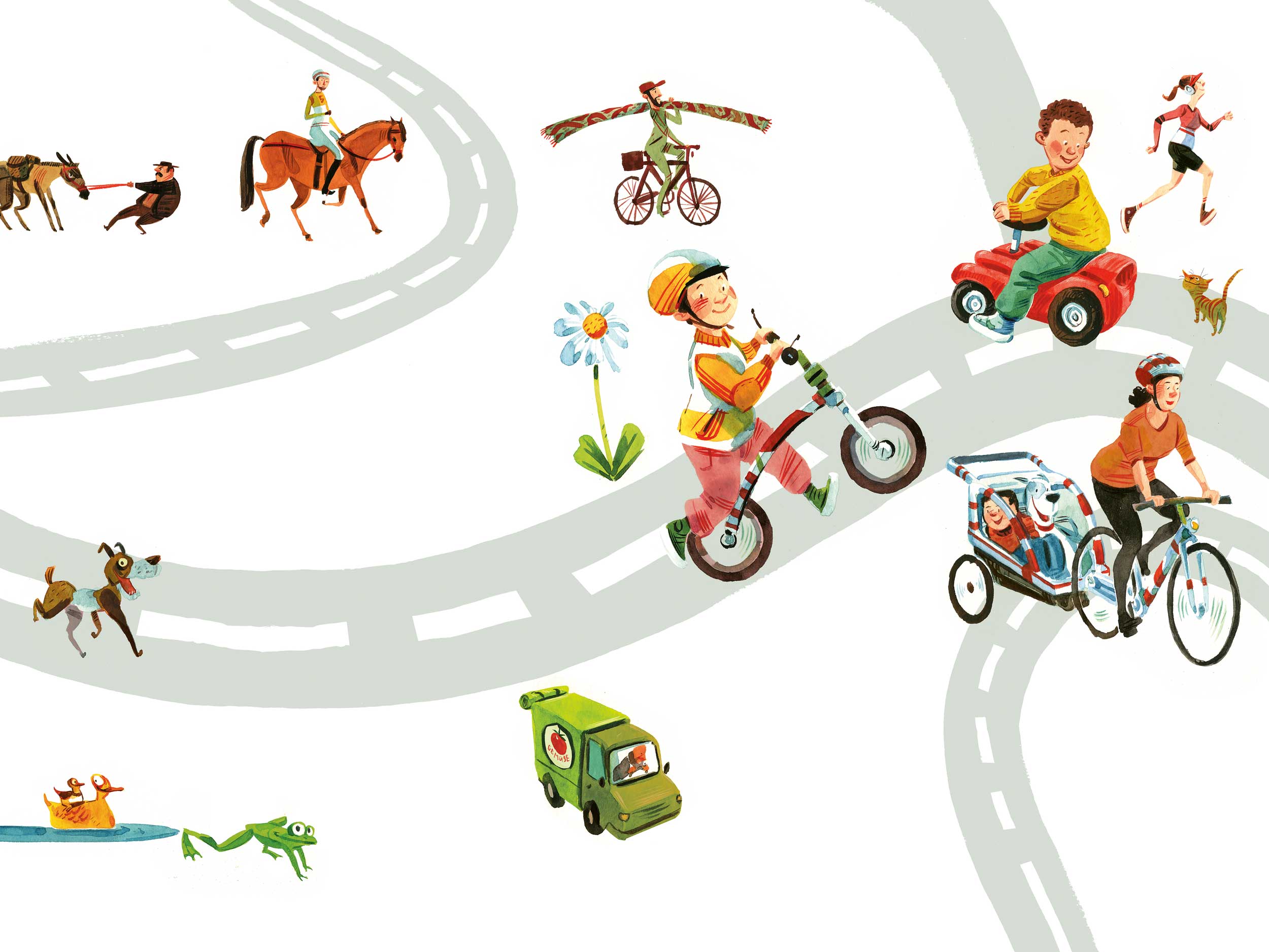 Studien legen nahe, dass eben jene «Radfahrkompetenz» vor allem vom Einstiegsalter abhängt, mehr noch als vom regelmässigen Radeln. Also: Früh übt sich, was ein souveräner Radler werden will. Für die ersten Jahre gilt für Radausflüge: am besten nur mit zwei Erwachsenen. Einer vorne weg zum Nachahmen, einer hintendran zum Sichern. Kontrollcheck: Kann das Kind beim Rädchen die Fussbremse gut erreichen? Sind die Handbremsen nicht zu stramm eingestellt? Ist der Lenkergriff aus nachgiebigem Werkstoff mit weicheren, vergrösserten Enden, dass er bei einem Sturz keinen Schaden an Bauch und Genitalien anrichtet? Ist der Helm in einer hellen, auffallenden Farbe? Sitzt er richtig? Sprich: Passen höchstens ein bis zwei Finger zwischen Band und Kinn? Liegt der Helmrand zwei Fingerbreit über der Nasenwurzel?
