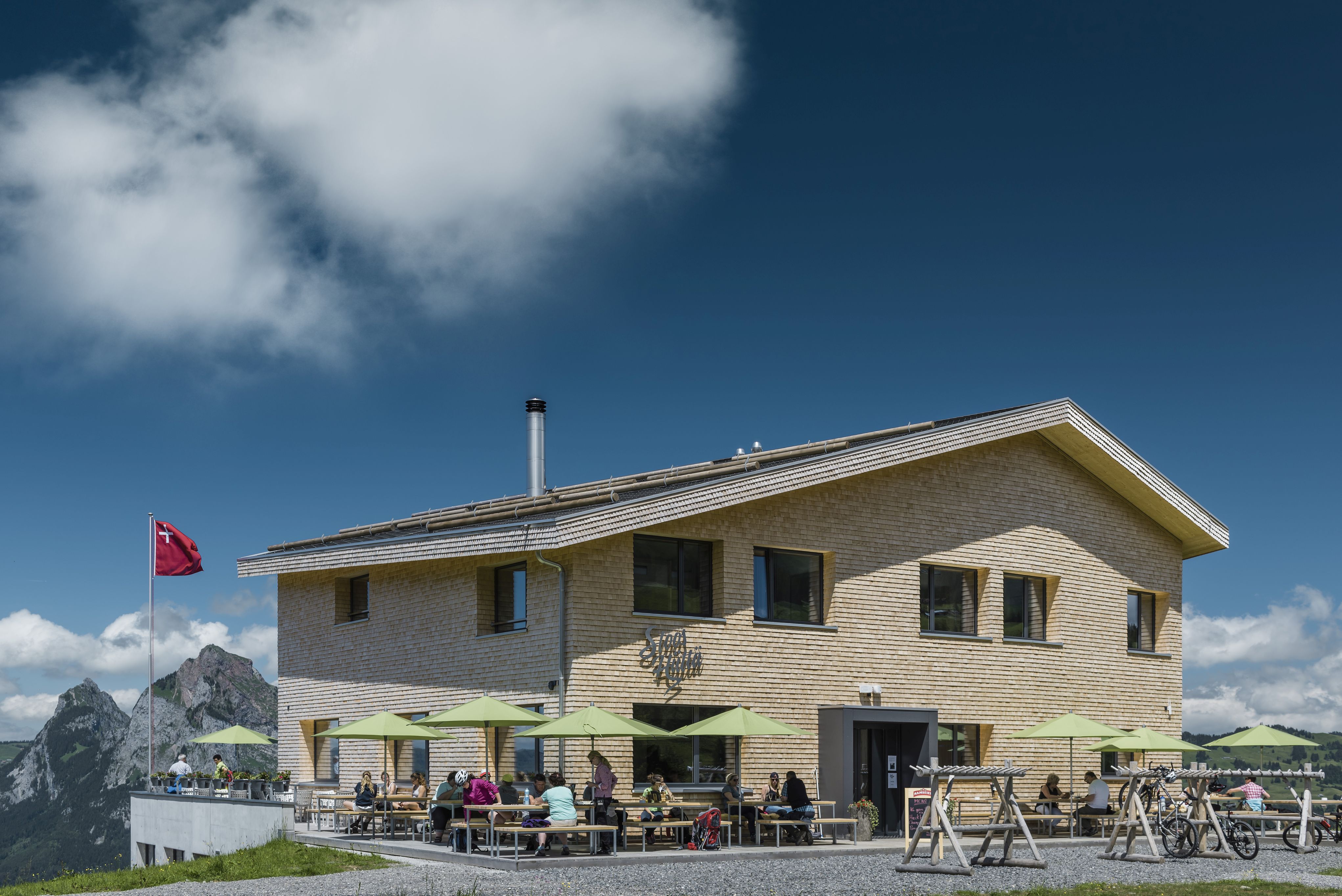 Die steilste Standseilbahn der Welt transportiert Gäste ins autofreie Dorf Stoos. Noch ein paar Minuten zu Fuss bergauf, und schon erreicht man die Stoos Hüttä, von der aus man einen grandiosen Blick ins Bergpanorama geniesst. Im Berghotel können bis zu 41 Personen übernachten. Die Zimmer haben drei bis sechs Betten und sind schlicht, hell und geräumig. Die Kajütenbetten sind hier auf hohen Podesten platziert, so dass auch mal die ganze Familie in luftiger Höhe Matratze an Matratze liegt. Abendessen und Frühstück in der Gaststube mit freiem Blick in die Weite schmecken vorzüglich, da bleibt man auch gern mal mit einem Kartenspiel oder einem Rätselbuch gemütlich sitzen.