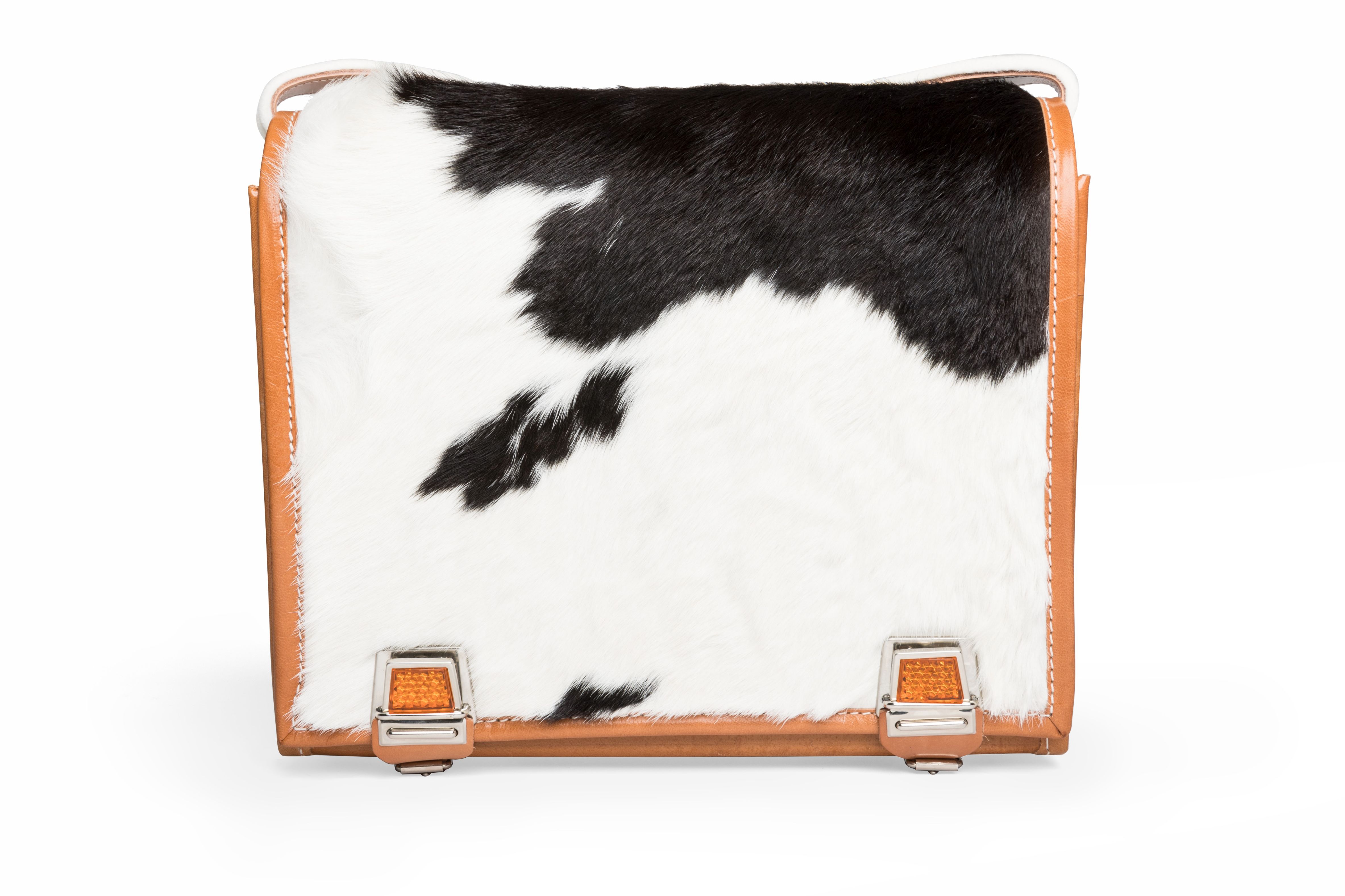Die verstellbaren Schulterriemen sind filzgepolstert. Der Tornister aus Kalbfell und chromfreiem, pflanzlich gegerbtem Ziegenleder ist in zwei Ausführungen erhältlich: Schwarz-Weiss und Braun-Weiss, mit Hefttasche aus Stoff oder aus Ziegenleder.