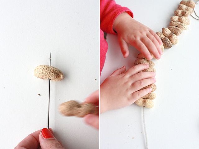 Und so wirds gemacht: Mit der Stricknadel mittig die Erdnüsse durchstechen, danach werden die Erdnüsse quer in gewünschter Kettenlänge nacheinander aufgefädelt. Am oberen und unteren Ende der Kette wird ein Aststückchen befestigen, damit sich die Vögel daran festhalten können.