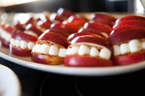 5 - Die essbaren Gebisse aus Äpfeln, Marshmallows und Erdnussbutter (vielleicht tuts auch Nutella?) sind in den Staaten schon lange der Hit. Eine unter vielen Anleitungen gibt’s z.B. hier: