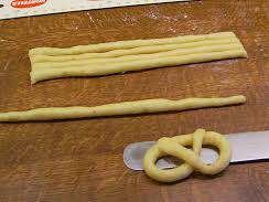 Formen Bleistiftdicke Röllchen drehen, in 15 cm lange Stücke schneiden, Brezeli formen oder Brezeliausstecher nehmen; so haben Sie im Nu perfekte Brezeli.