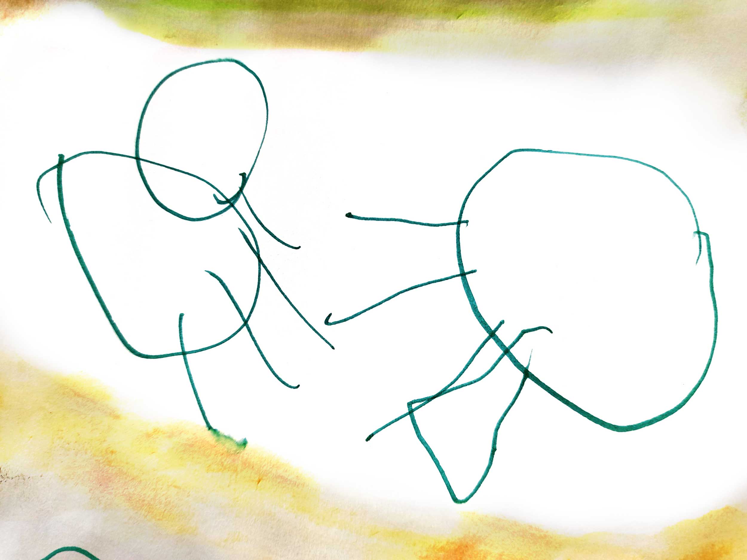 Wir kennen im Zusammenhang mit der frühen Darstellung von Menschen durch Kinder den Begriff «Kopffüssler». In der Fachwelt wird darüber gestritten: Stellt diese Abbildung von einem Kopf mit Füssen nun ein reduziertes Gebilde oder bereits einen vollständigen Menschen dar? Schliesslich erkenne man eine Einheit in der Darstellung, und keine voneinander getrennten Striche und runden Formen. Ob man dem einen oder anderen Lager folgt, immer vollzieht sich beim Kind ein interessantes Zusammenspiel von Denken, Papier und Stift. Eine anschauliche Variante findet sich in der Abbildung 3 eines vierjährigen Kindes, bei dem sich zwei Menschen die Hand geben.