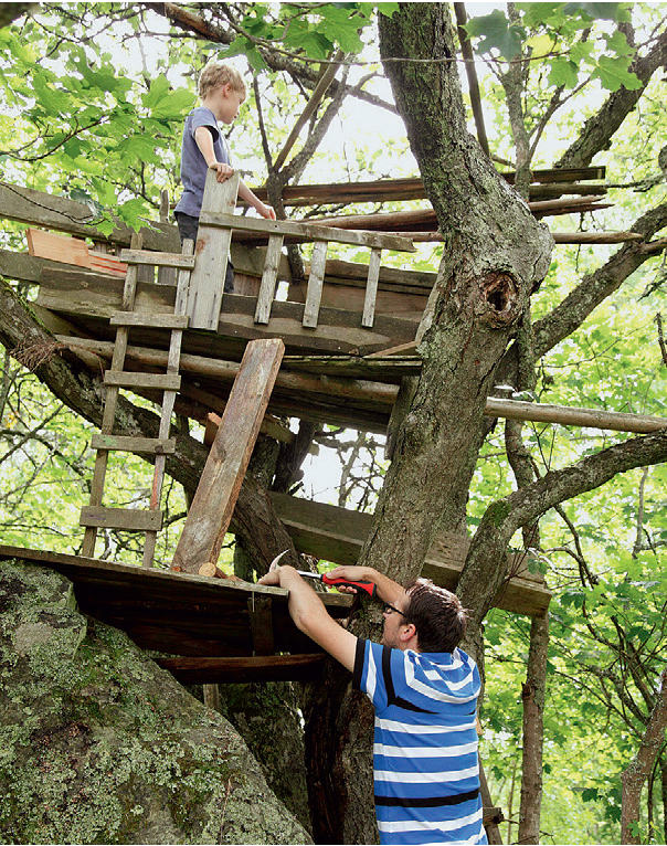 - Baumhaus bauen in dem Kinder ungestört in ihre Fantasiewelten eintauchen können. Eine simple Plattform, bestehend aus einem stabilen Brett, reicht, um Abstand zu gewinnen und die vertraute Welt aus anderer Perspektive zu betrachten.