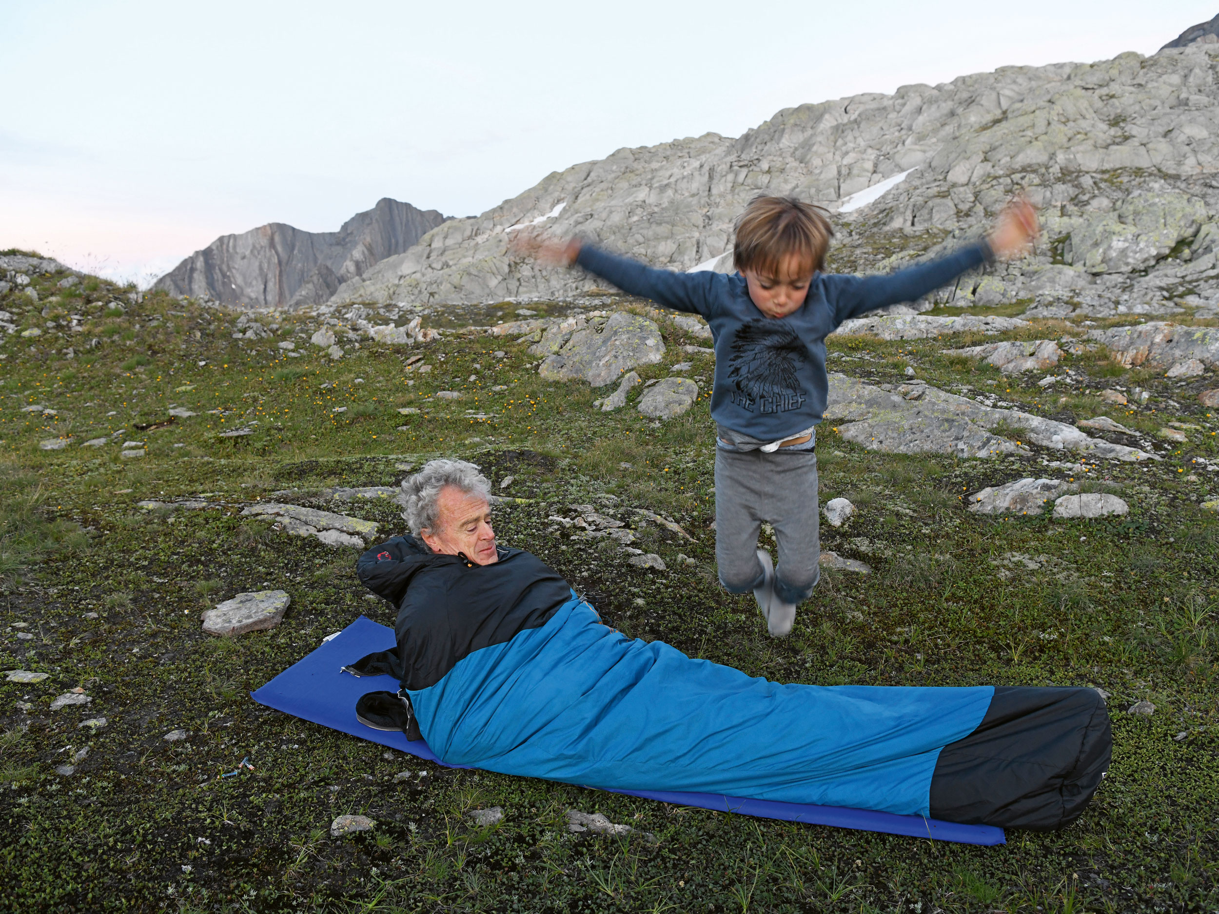Da kommt ihm in den Sinn, dass er Papa noch nicht richtig Gute Nacht gesagt hat. Also nochmals nach draussen! Jonathan rennt zum Vater, der wie eine Mumie verpackt im Schlafsack liegt, und hüpft auf dem Rückweg zum x-ten Mal über die Zeltschnüre. Mit scheinbar endloser Energie. Wieder im Schlafsack, raschelt es vor dem Zelteingang. Anushka steckt den Kopf zur Zeltöffnung hinein. Sie will den Schlafsack tauschen in der Meinung, meiner sei wärmer.