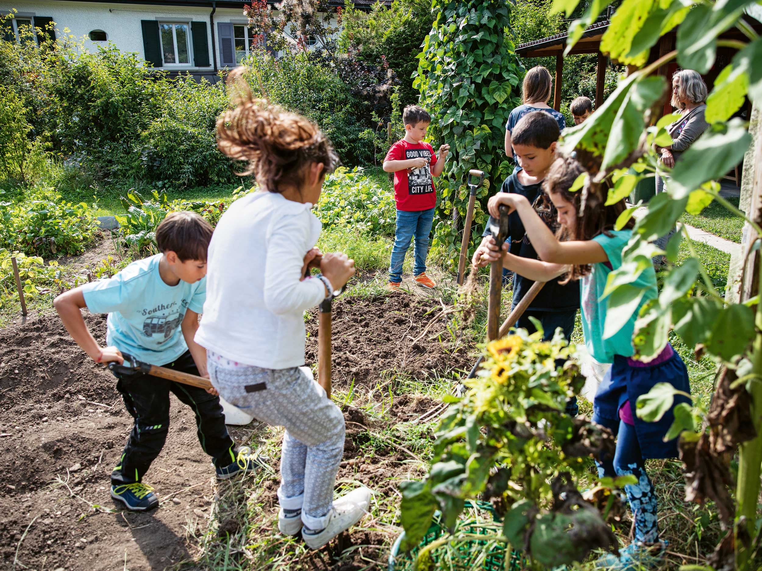 Offene Gartennachmittage in Bioterra-Gärten: Gärten in der ganzen Schweiz bieten Kindern während der Gartensaison die Möglichkeit, zu bestimmten Zeiten unverbindlich vorbeizuschauen und Gartenluft zu schnuppern. Unter Anleitung können die Kinder kleine Gartenarbeiten übernehmen.
