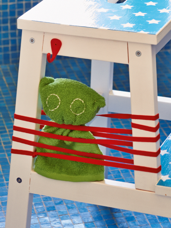 3. Ein Band ums Garn beim «Hals» fädeln – so kann das Waschlappentier aufgehängt werden und immer wieder gut trocknen.