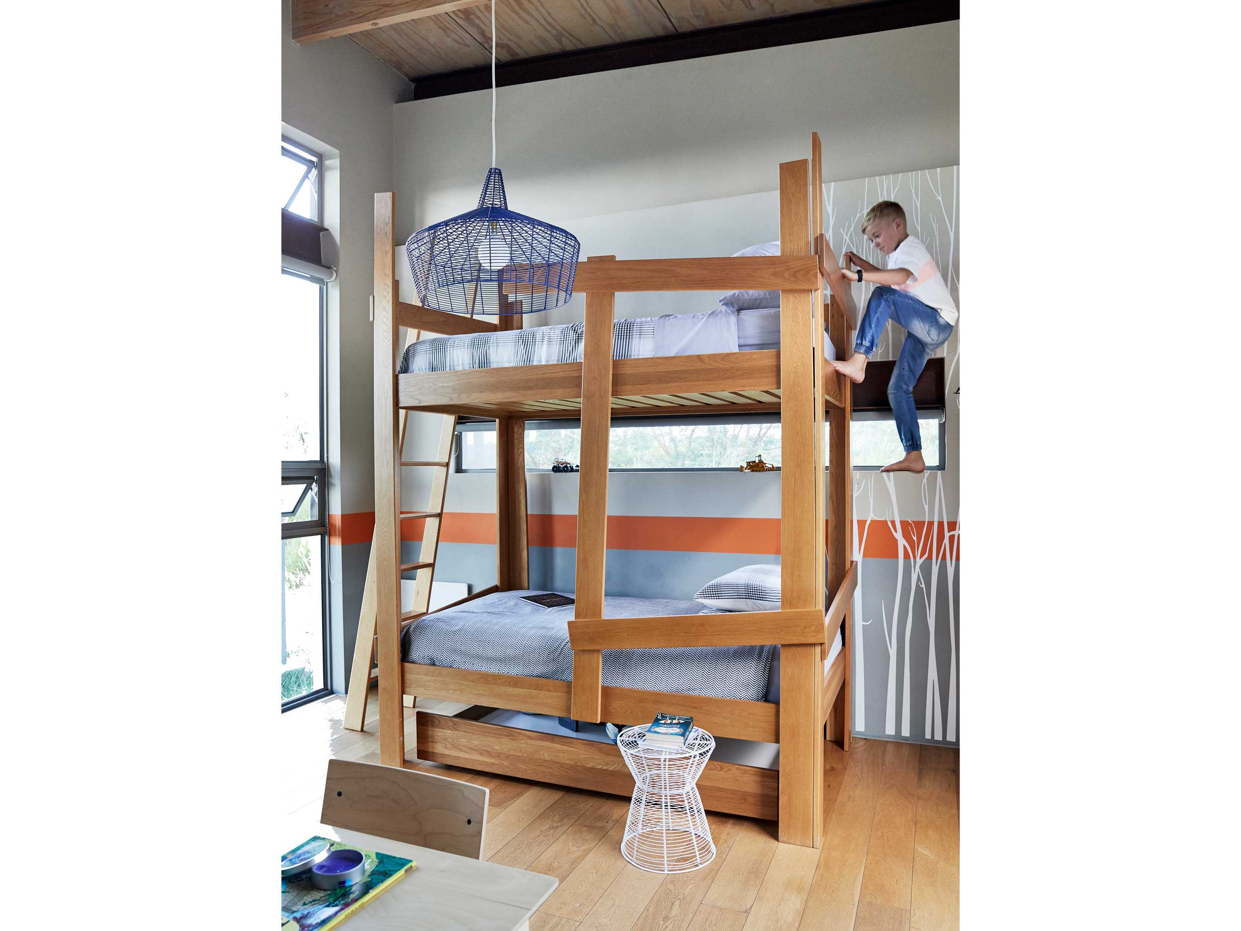 Doppelbelegung bringt oft auch doppelte Unordnung. Zielen Sie deshalb darauf ab, alles einladend und schlicht zu gestalten. Betten, die sich am Fussende berühren, sorgen für Geborgenheit – und lassen trotzdem ein Gefühl der Unabhängigkeit zu. Niedere Betten erleichtern den Kindern das selbstständige Rein- und Rausklettern.