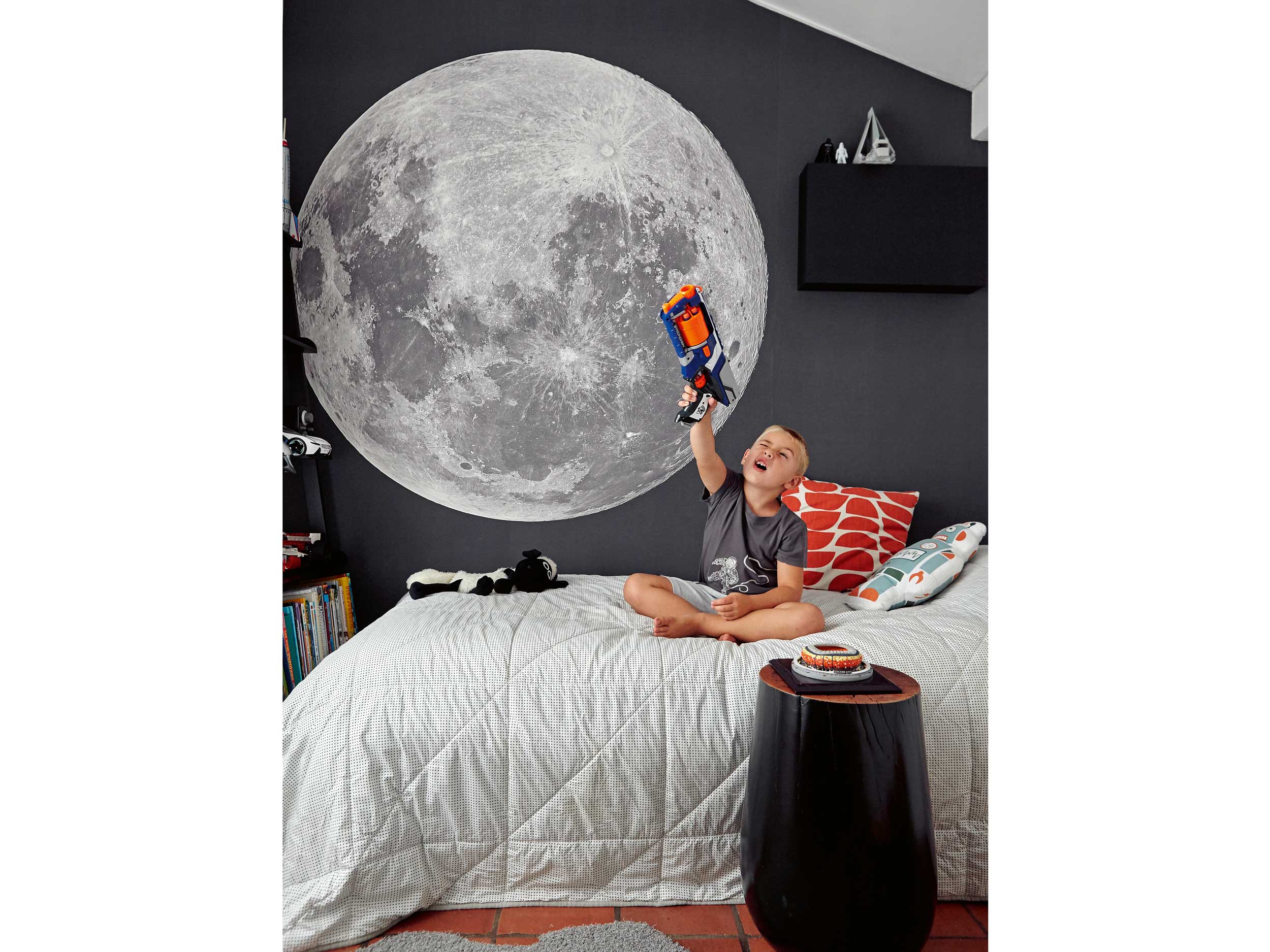 Ein Kinderzimmer muss nicht ausgefeilt oder kostspielig dekoriert werden, um inspirierend zu wirken. Es kann auch etwas so Einfaches sein wie eine überdimensionale Weltkarte, eine Zimmerdecke voller nachtleuchtender Sterne – oder ein XXL-Aufkleber des Mondes.